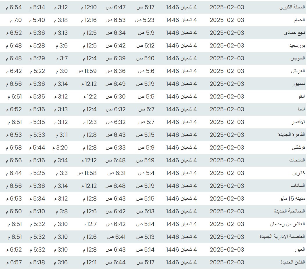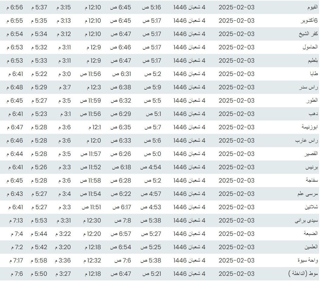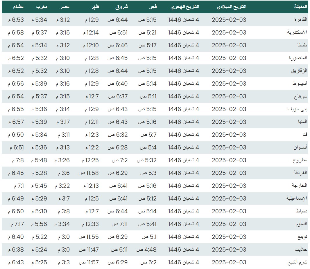وفيما يلي مواقيت الصلاة، لعدد من مدن ومحافظات الجمهورية من واقع بيانات الهيئة العامة للمساحة