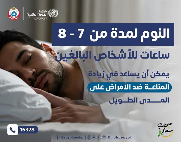 وأضافت وزارة الصحة في منشور توعوي، أن النوم لمدة من ٧ إلى ٨ ساعات، يساعد في زيادة المناعة ضد الأمراض على المدى الطويل.