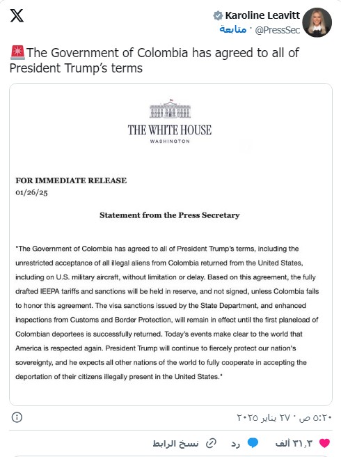 وقالت المتحدثة باسم البيت الأبيض كارولين ليفات في بيان صدر في وقت متأخر من مساء أمس إن "حكومة كولومبيا وافقت على جميع شروط الرئيس ترامب، بما في ذلك القبول غير المقيد لجميع الأجانب غير الشرعيين من كولومبيا العائدين من الولايات المتحدة، على متن الطائرات العسكرية الأمريكية، دون قيود أو تأخير".