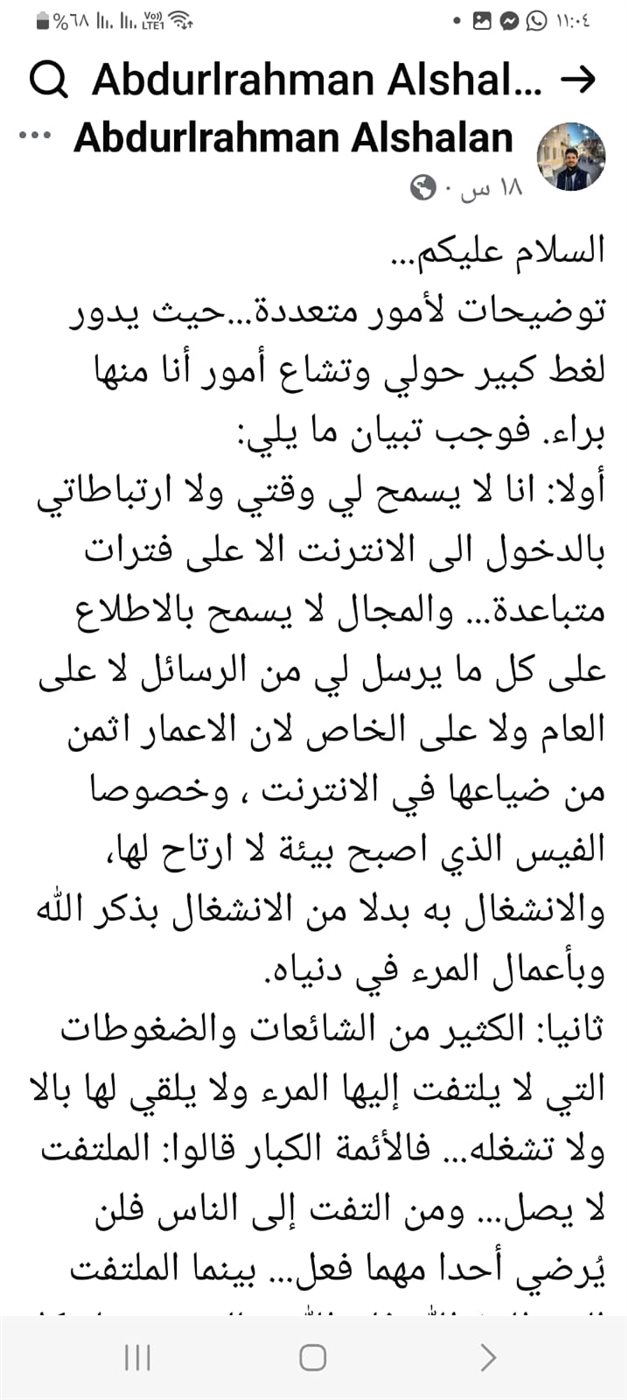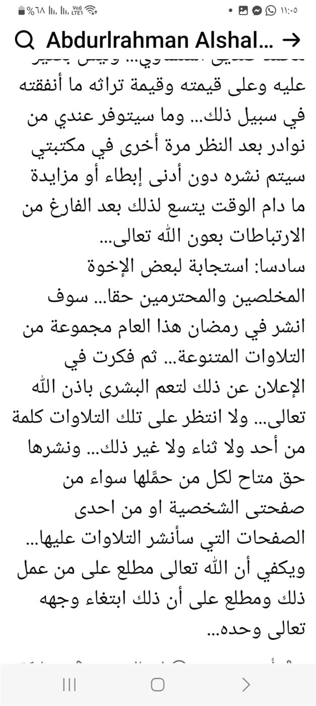 يختتم الثري الخليجي بيانه قائلًا: "استجابة لبعض الإخوة المخلصين والمحترمين حقًا، سوف أنشر في رمضان هذا العام مجموعة من التلاوات المتنوعة، ثم فكرت في الإعلان عن ذلك؛ لتعم البشرى باذن الله تعالى، ولا أنتظر على تلك التلاوات كلمة من أحد ولا ثناء ولا غير ذلك، ونشرها حق متاح لكل من حمَّلها سواء من صفحتى الشخصية أو من احدى الصفحات التي سأنشر التلاوات عليها، ويكفي أن الله تعالى مطلع على من عمل ذلك ومطلع على أن ذلك ابتغاء وجهه تعالى وحده".