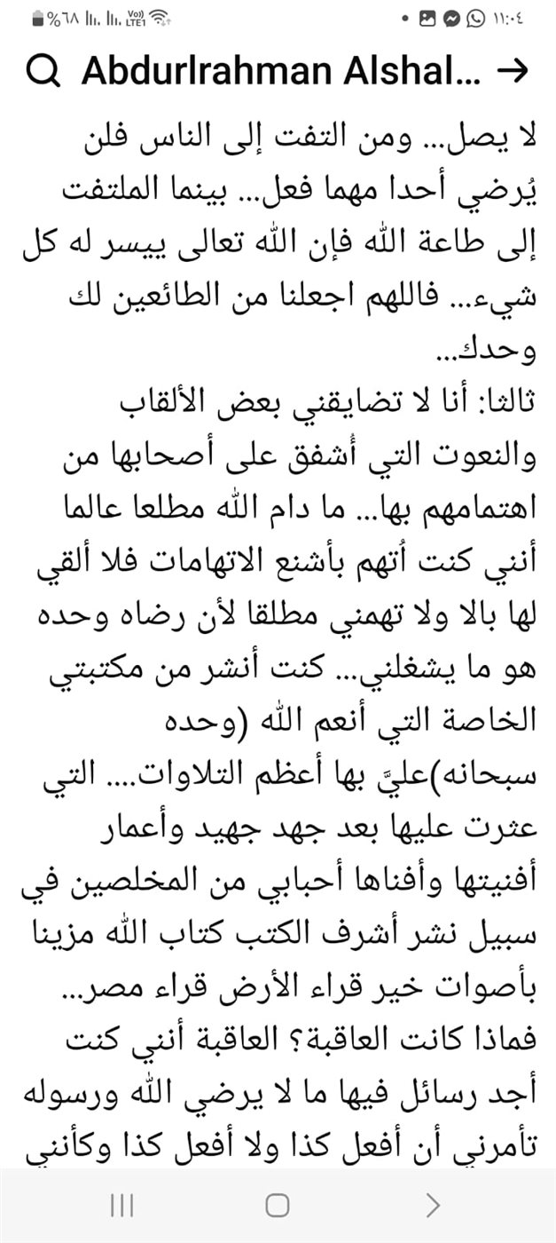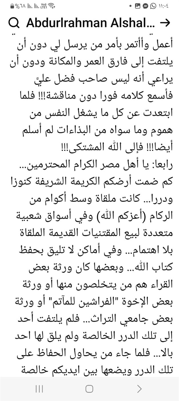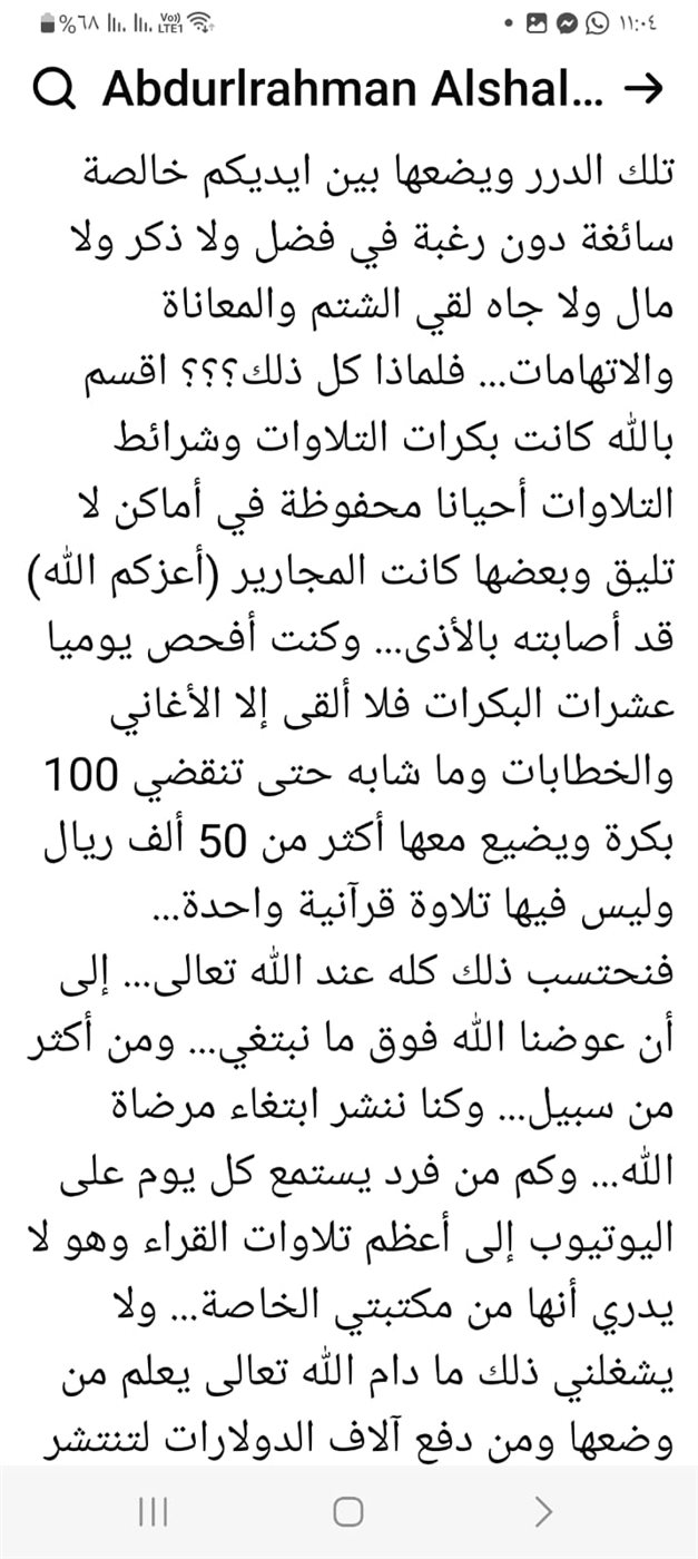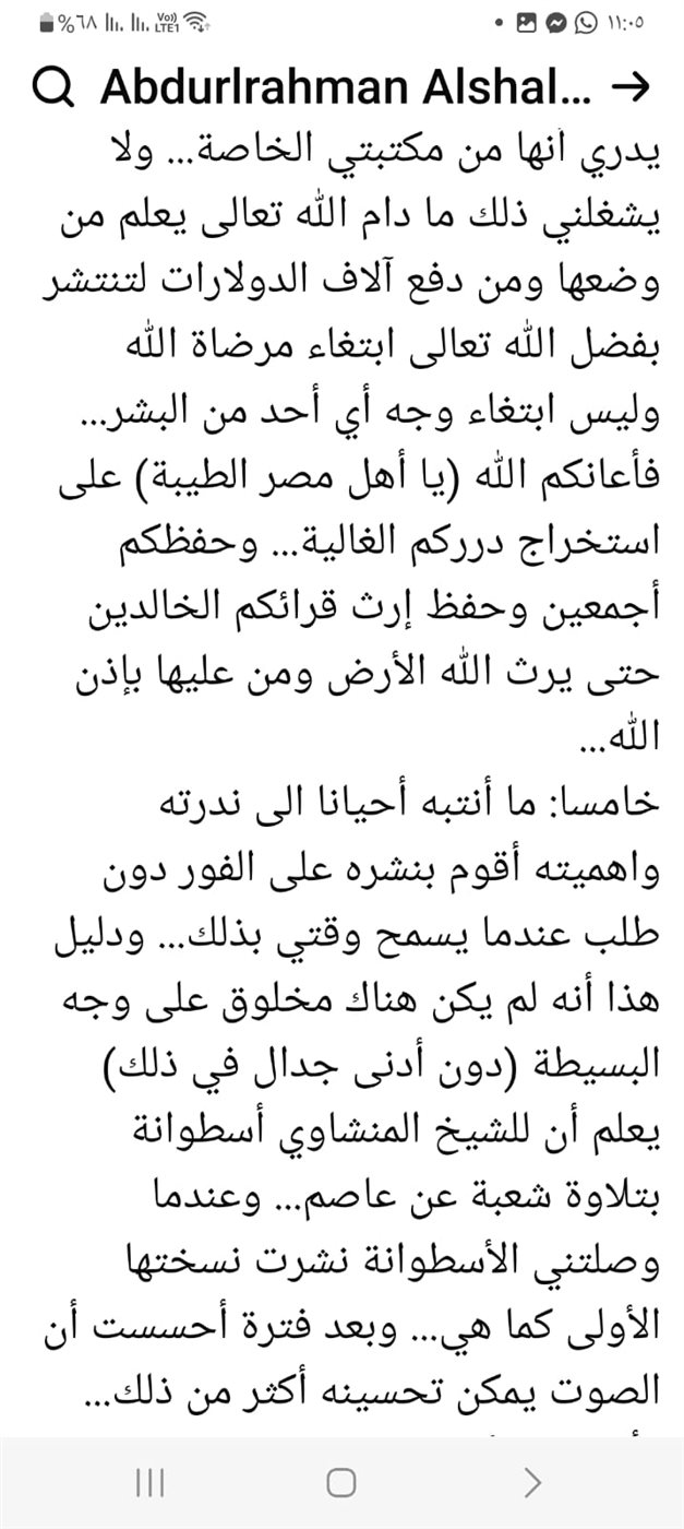 في النقطة الرابعة يقول الرجل الذي بدا غاضبًا من الهجوم غير المبرر على شخصه قائلًا: "يا أهل مصر الكرام المحترمين..كم ضمَّت أرضكم الكريمة الشريفة كنوزًا ودررًا، كانت ملقاة وسط أكوام من الرُكام (أعزكم الله) وفي أسواق شعبية متعددة لبيع المقتنيات القديمة الملقاة بلا اهتمام، وفي أماكن لا تليق بحفظ كتاب الله، وبعضها كان ورثة بعض القراء هم مَن يتخلصون منها أو ورثة بعض الإخوة "الفراشين للمآتم" أو ورثة بعض جامعي التراث، فلم يلتفت أحد إلى تلك الدُرر الخالصة ولم يلق لها أحد بالًا. فلما جاء من يحاول الحفاظ على تلك الدرر ويضعها بين أيديكم خالصة سائغة دون رغبة في فضل ولا ذكر ولا مال ولا جاه لقي الشتم والمعاناة والاتهامات... فلماذا كل ذلك"؟ مردفًا: "أقسم بالله.. كانت بكرات التلاوات وشرائط التلاوات أحيانًا محفوظة في أماكن لا تليق وبعضها كانت المجارير -أعزكم الله- قد أصابته بالأذى، وكنت أفحص يوميا عشرات البكرات فلا ألقى إلا الأغاني والخطابات وما شابه حتى تنقضي 100 بكرة ويضيع معها أكثر من 50 ألف ريال وليس فيها تلاوة قرآنية واحدة، فنحتسب ذلك كله عند الله تعالى إلى أن عوضنا الله فوق ما نبتغي، ومن أكثر من سبيل، وكنا ننشر ابتغاء مرضاة الله، وكم من فرد يستمع كل يوم على اليوتيوب إلى أعظم تلاوات القراء وهو لا يدري أنها من مكتبتي الخاصة، ولا يشغلني ذلك ما دام الله تعالى يعلم من وضعها ومن دفع آلاف الدولارات لتنتشر بفضل الله تعالى، ابتغاء مرضاة الله وليس ابتغاء وجه أي أحد من البشر، فأعانكم الله يا أهل مصر الطيبة على استخراج درركم الغالية، وحفظكم أجمعين وحفظ إرث قرائكم الخالدين حتى يرث الله الأرض ومن عليها بإذن الله"