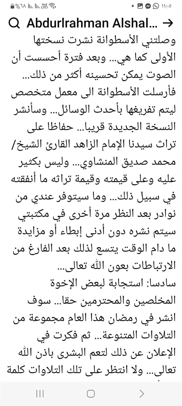 وفي النقطة الخامسة تحديدًا من البيان الغاضب..يأتي ذكر اسم الشيخ المنشاوي تحديدًا، حيث كتب: "ما أنتبه أحيانا إلى ندرته وأهميته أقوم بنشره على الفور دون طلب عندما يسمح وقتي بذلك، ودليل هذا أنه لم يكن هناك مخلوق على وجه البسيطة -دون أدنى جدال في ذلك- يعلم أن للشيخ المنشاوي أسطوانة بتلاوة شعبة عن عاصم، وعندما وصلتني الأسطوانة نشرت نسختها الأولى كما هي، وبعد فترة أحسست أن الصوت يمكن تحسينه أكثر من ذلك، فأرسلت الأسطوانة إلى معمل متخصص؛ ليتم تفريغها بأحدث الوسائل، وسأنشر النسخة الجديدة قريبا؛ حفاظًا على تراث سيدنا الإمام الزاهد القارئ الشيخ محمد صديق المنشاوي، وليس بكثير عليه وعلى قيمته وقيمة تراثه ما أنفقته في سبيل ذلك، وما سيتوفر عندي من نوادر بعد النظر مرة أخرى في مكتبتي سيتم نشره دون أدنى إبطاء أو مزايدة ما دام الوقت يتسع لذلك بعد الفارغ من الارتباطات بعون الله تعالى".