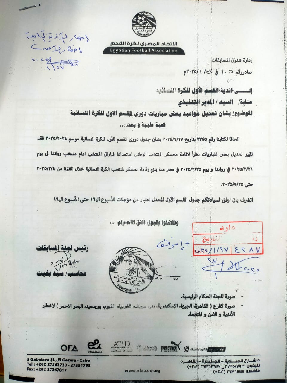 الكرة النسائية، قررت لجنة المسابقات باتحاد الكرة بقيادة المحاسب سيد بخيت، تعديل مواعيد عدد من مباريات الدوري الممتاز للكرة النسائية الموسم الجاري بسبب معسكر المنتخب الأول للكرة النسائية استعدادا لمواجهتي رواندا.