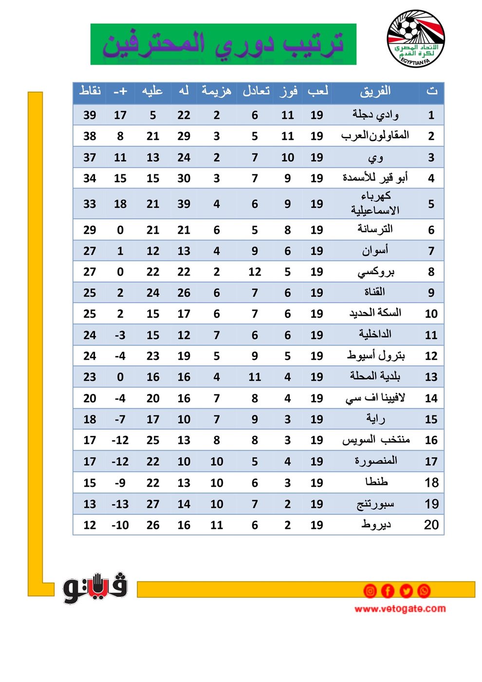 ويتصدر وادي دجلة جدول ترتيب دوري المحترفين بعد ختام مباريات الدور الأول برصيد 39 نقطة، ثم يحل المقاولون في الوصافة بفارق نقطة وحيدة عن المركز الأول.