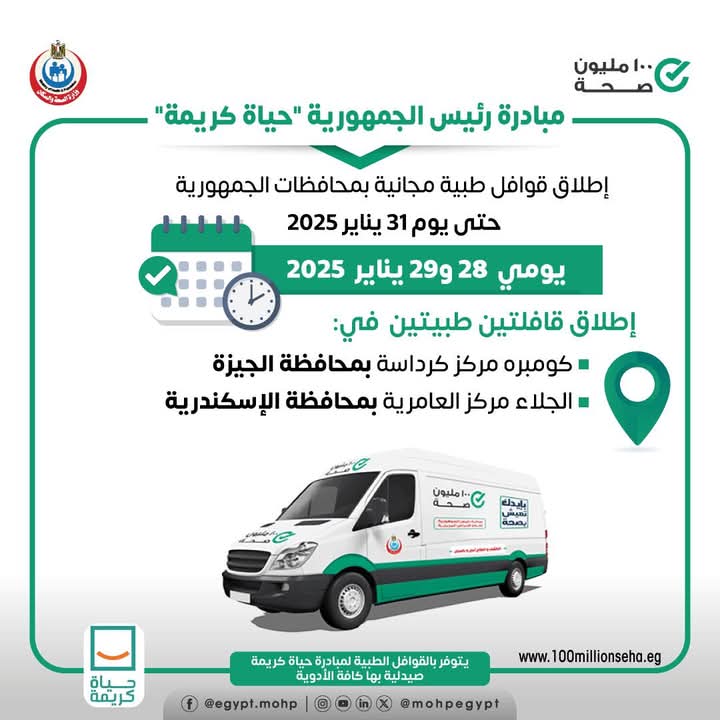 أعلنت وزارة الصحة إطلاق قافلتين طبيتين ضمن مبادرة رئيس الجمهورية حياة كريمة يومي ٢٨ و٢٩ يناير ٢٠٢٥ للكشف والعلاج مجانًا في التخصصات الطبية:نساء وولادة - خدمات تنظيم الأسرة - الأطفال والباطنة - الأنف والأذن والعظام - الجراحة - الرمد الأسنان - القلب - الجلدية وخدمات الأشعة والتحاليل.