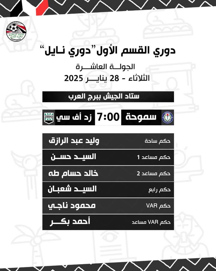 مباراة سموحة ضد زد إف سي وليد عبد الرازق حكما للساحة ويعاونه كل من السيد حسن مساعد أول وخالد حسام طه مساعد ثاني والسيد شعبان حكمًا رابعًا ومحمود ناجي حكم فيديو وأحمد بكر حكم فيديو مساعد .