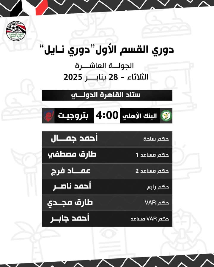 مباراة البنك الأهلي ضد بتروجيت أحمد جمال حكما للساحة ويعاونه كلا من أحمد طارق مصطفى مساعد أول وعماد فرج مساعد ثاني وأحمد ناصر عباس حكما رابعا وطارق مجدي حكم فيديو وأحمد جابر حكم فيديو مساعد.
