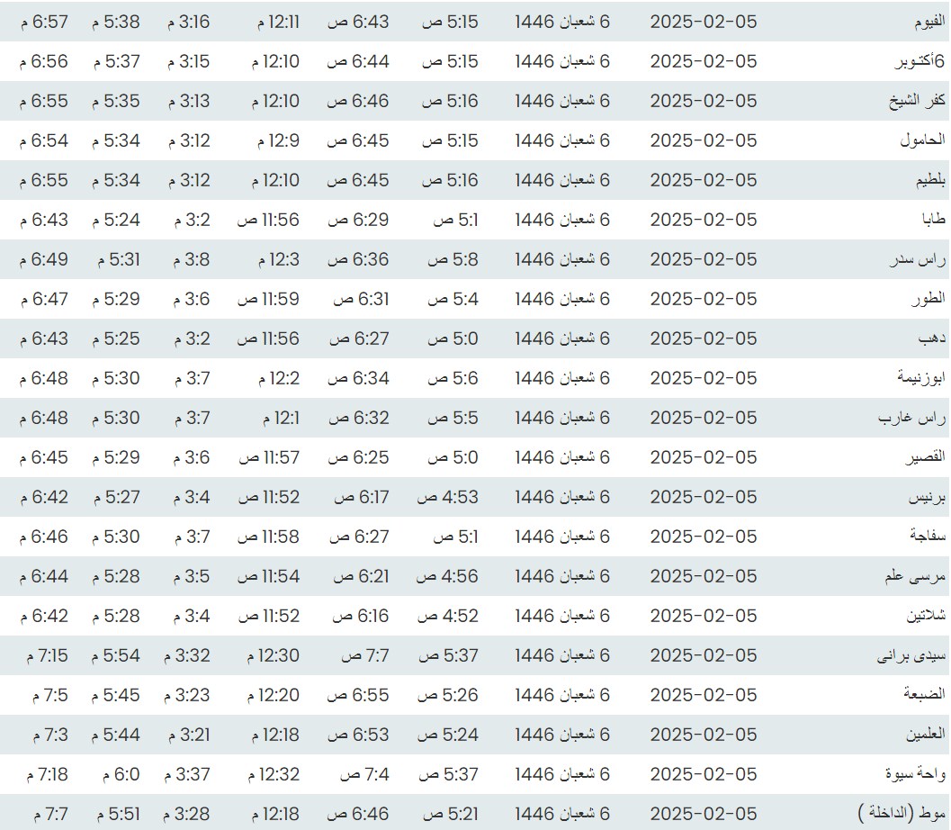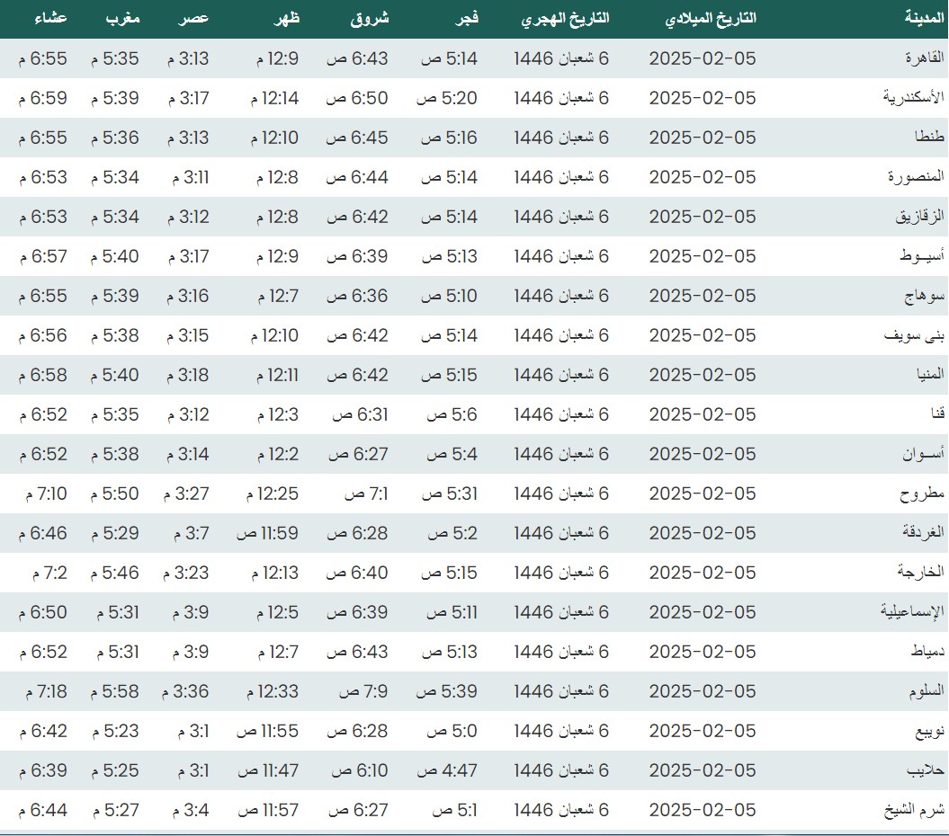 وفيما يلي مواقيت الصلاة، لعدد من مدن ومحافظات الجمهورية من واقع بيانات الهيئة العامة للمساحة