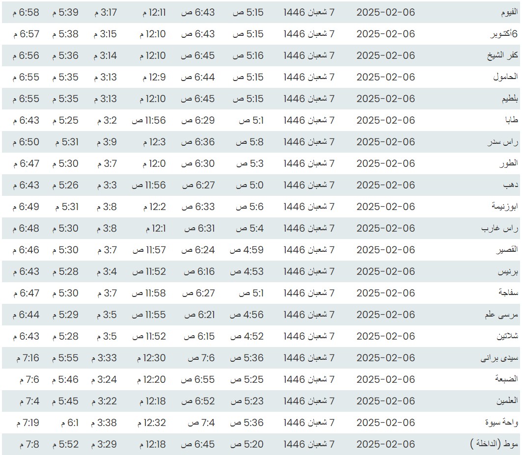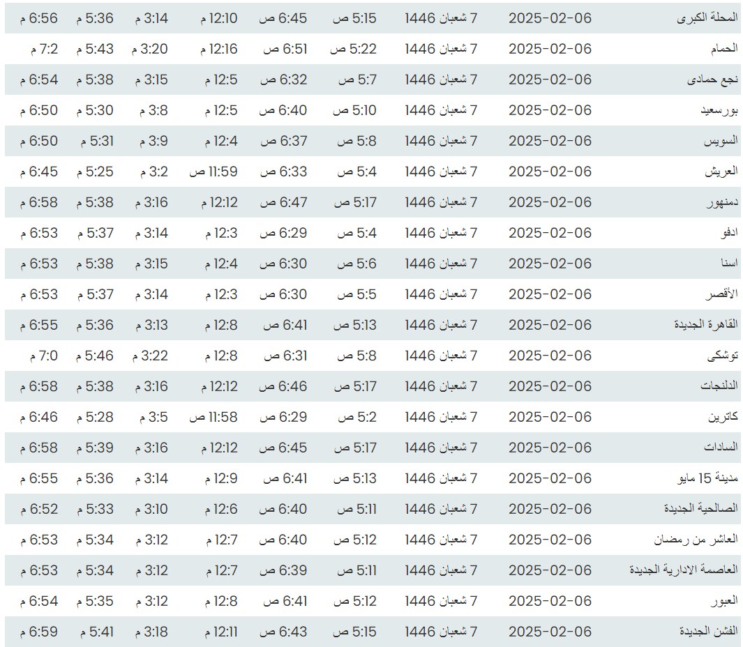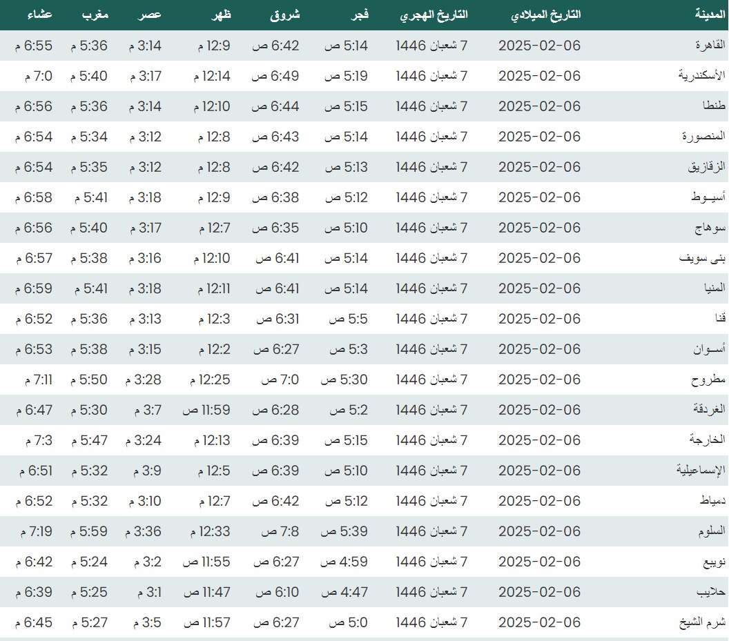 مواقيت الصلاة اليوم الخميس 6 - 2- 2025 في القاهرة والمحافظات