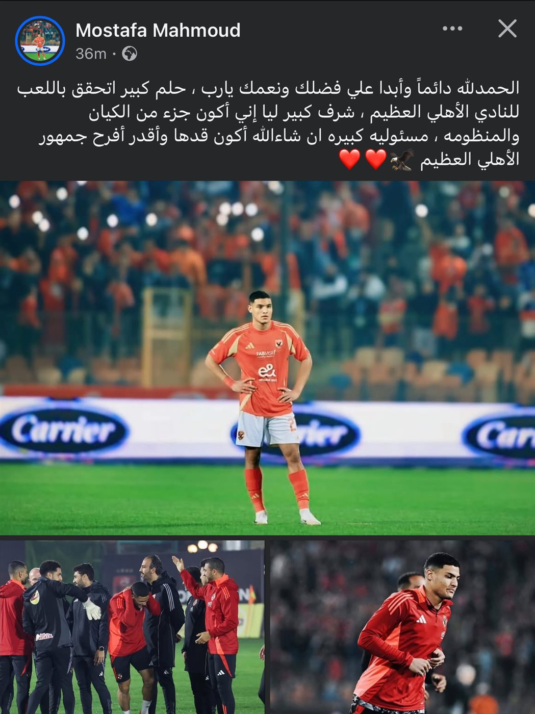 وأضاف: “ شرف كبير ليا إني أكون جزءً من الكيان والمنظومه، مسئوليه كبيره إن شاء الله أكون قدها وأقدر أفرح جمهور الأهلي العظيم ”.
