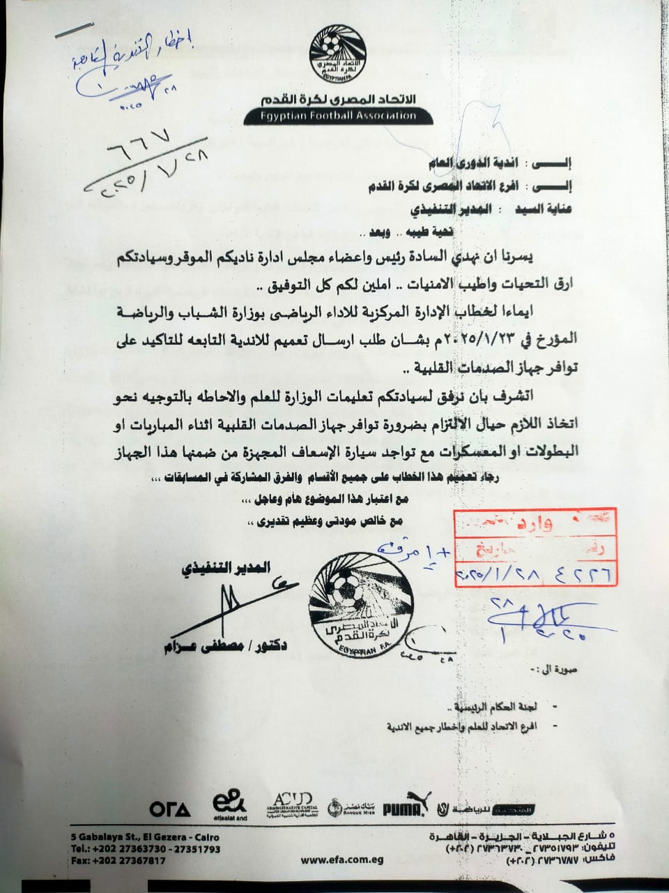 اتحاد الكرة، أرسل اتحاد الكرة خطابات رسمية لجميع الأندية التابعة له، يطالبها بضرورة تواجد جهاز صدمات القلب في جميع المباريات والبطولات وخلال المعسكرات.