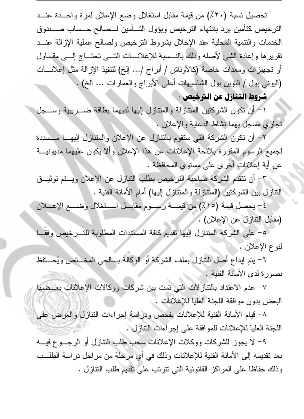 وألزمت المحافظة أصحاب الإعلانات بدفع رسوم ترخيص تبلغ 20% من قيمة الإعلان عند الحصول على تصريح لوضعه، وذلك لضمان تغطية تكاليف الإزالة والصيانة في حالة المخالفة.