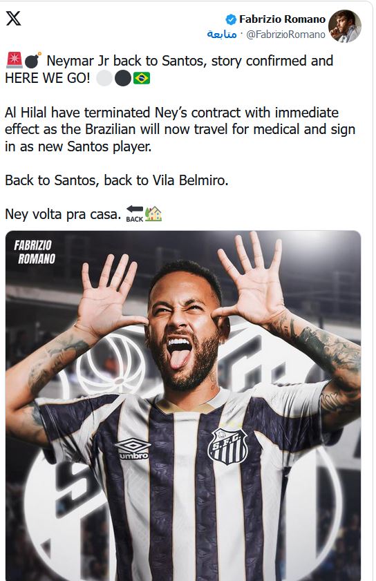 وجاء هذا الإعلان بعد أن أعلن الهلال الاثنين الماضي فسخ تعاقده مع اللاعب، مما أتاح لنيمار الانضمام إلى سانتوس في صفقة انتقال حر.