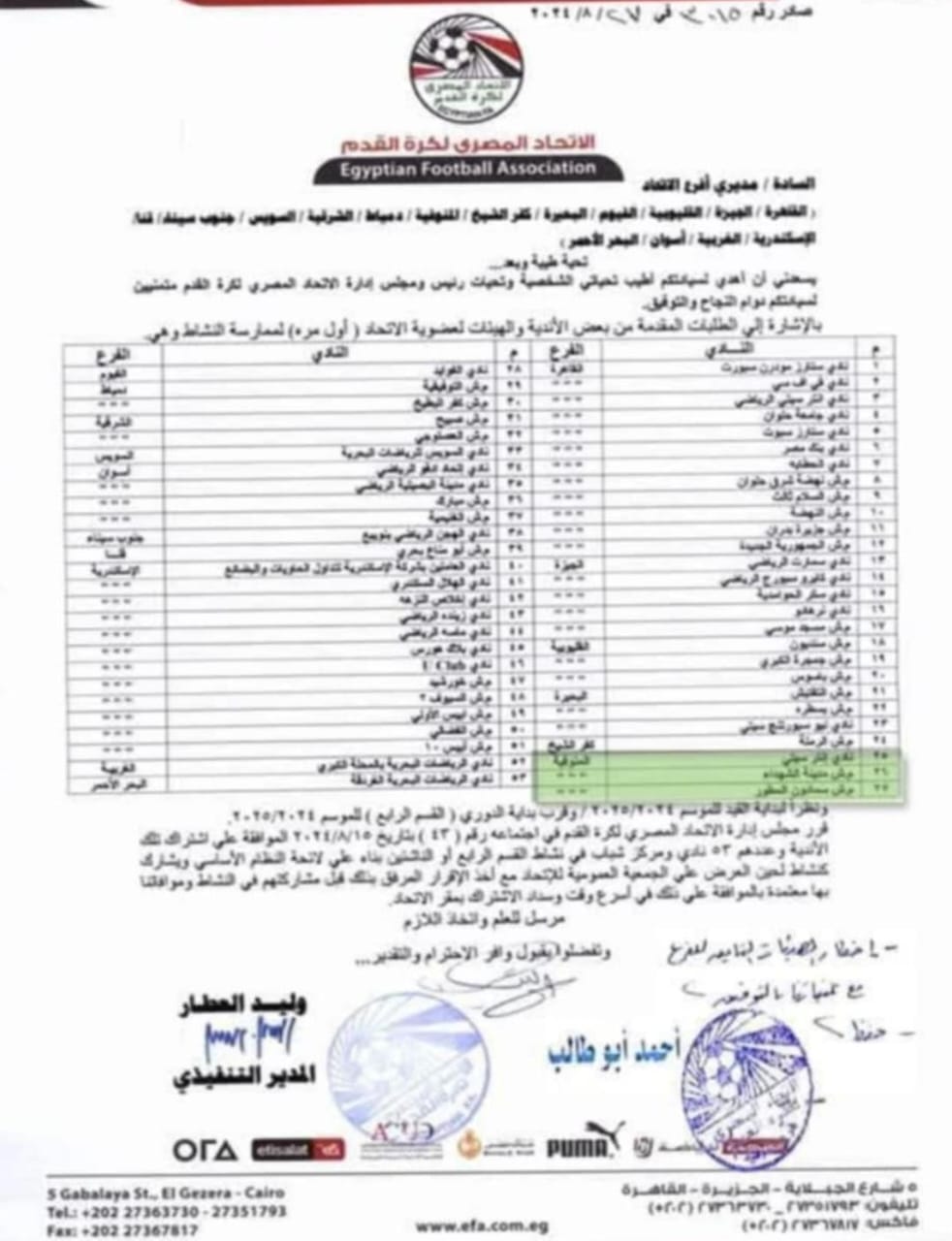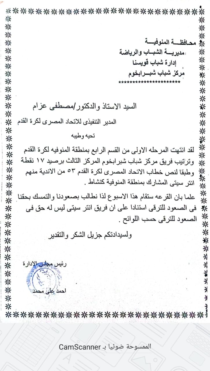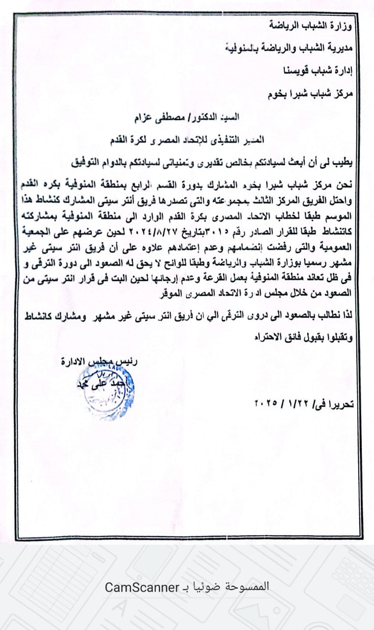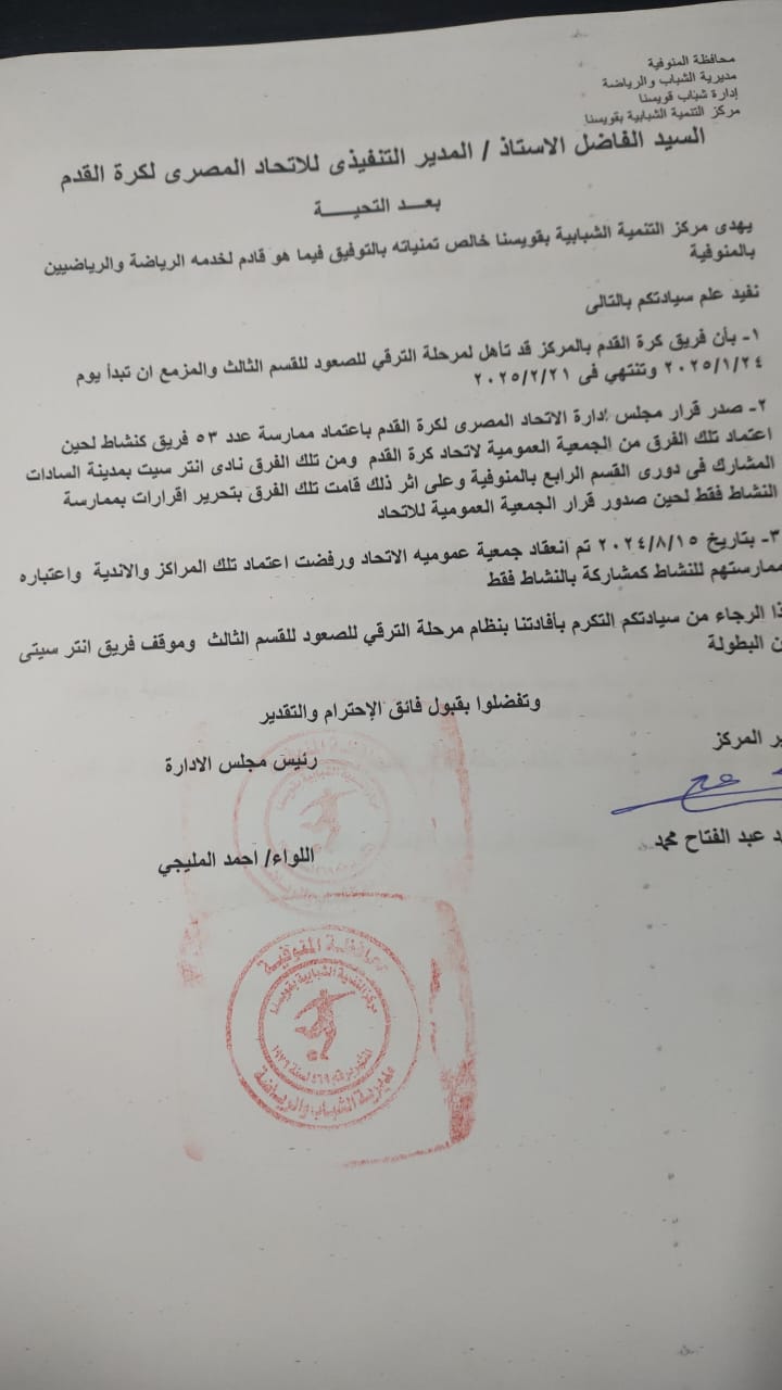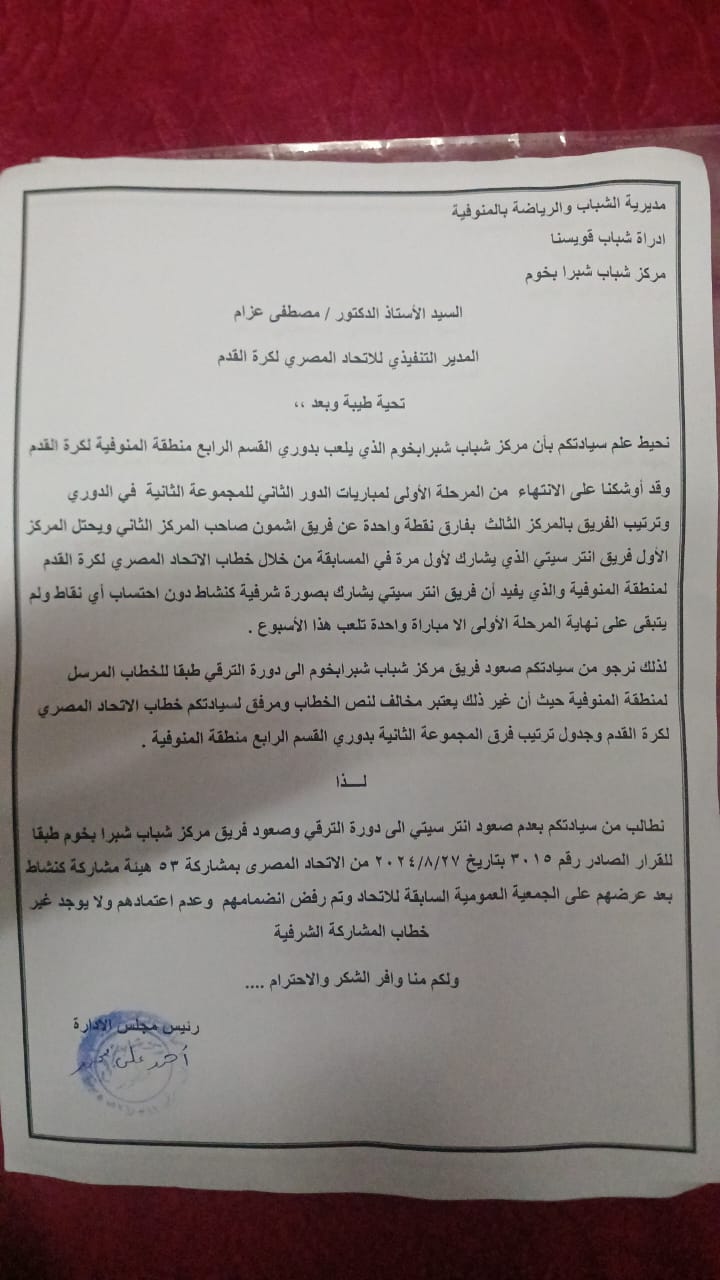 وأكد شبرا بخوم في خطابه الموجه للدكتور مصطفى عزام المدير التنفيذي للإتحاد المصرى لكرة القدم أن فريقه المشارك بدورة القسم الرابع بمنطقة المنوفية لكرة القدم احتل الفريق المركز الثالث بمجموعته والتي تصدرها فريق أنتر سيتى المشارك كنشاط هذا الموسم طبقا لخطاب الاتحاد المصرى لكرة القدم الوارد الى منطقة المنوفية بمشاركته كنشاط طبقا للقرار الصادر بتاريخ ٢٠٢٤/٨/٢٧ لحين عرضهم على الجمعية العمومية.
