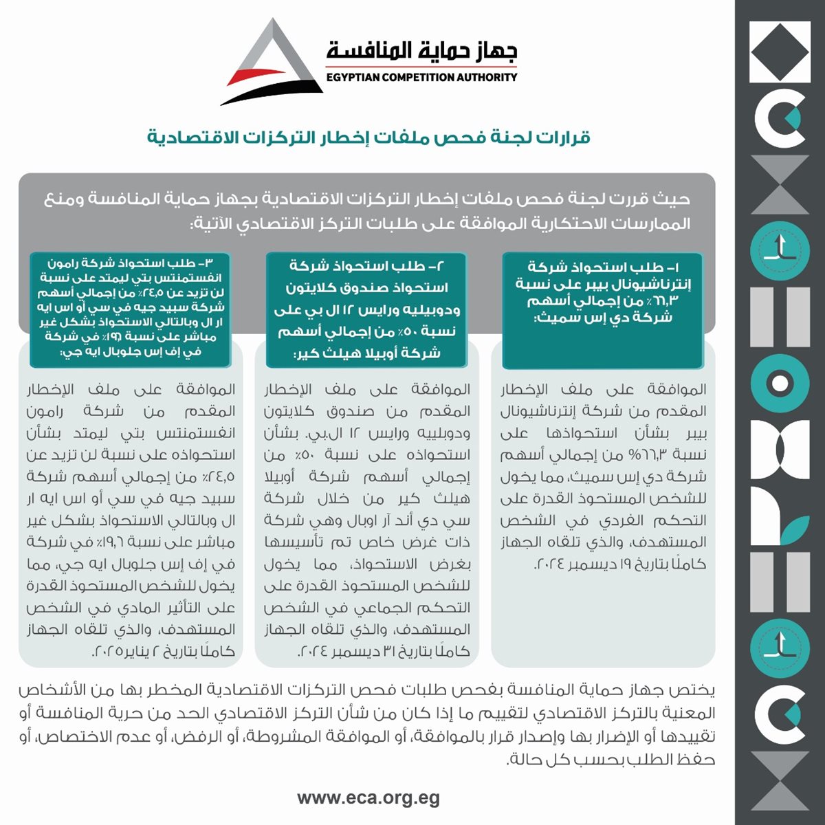 قررت لجنة فحص ملفات إخطار التركزات الاقتصادية بجهاز حماية المنافسة ومنع الممارسات الاحتكارية الموافقة على طلبات التركز الاقتصادي الآتية: