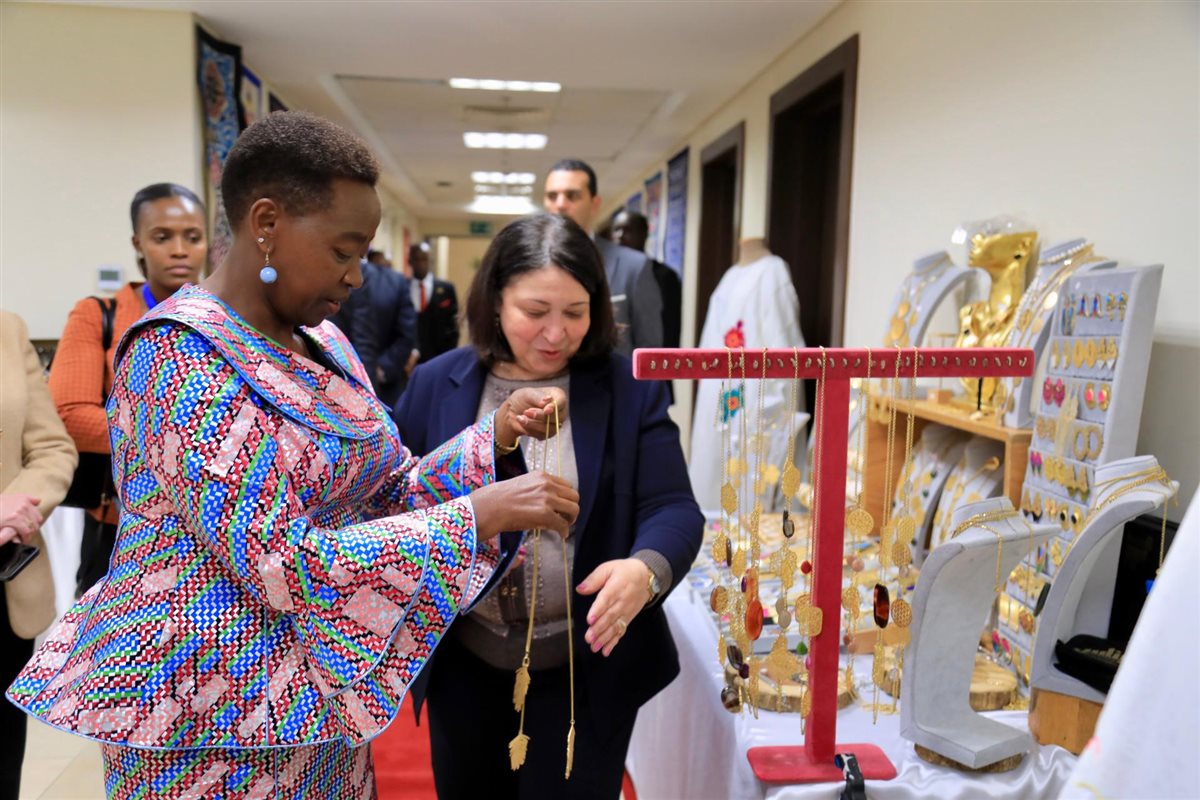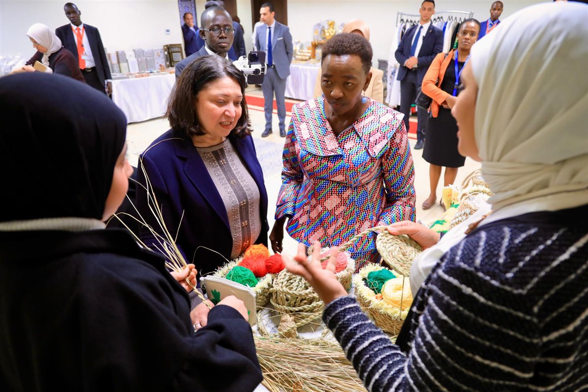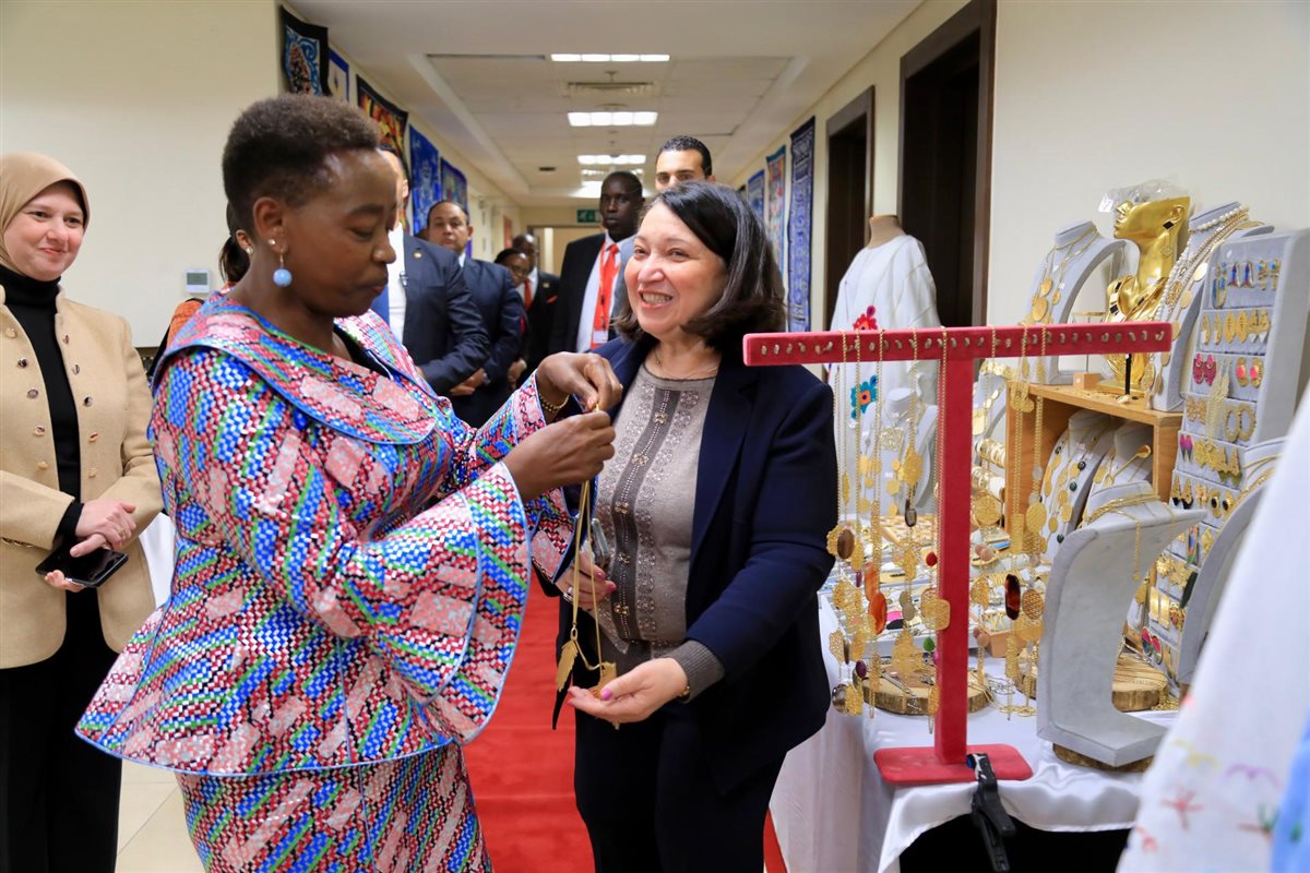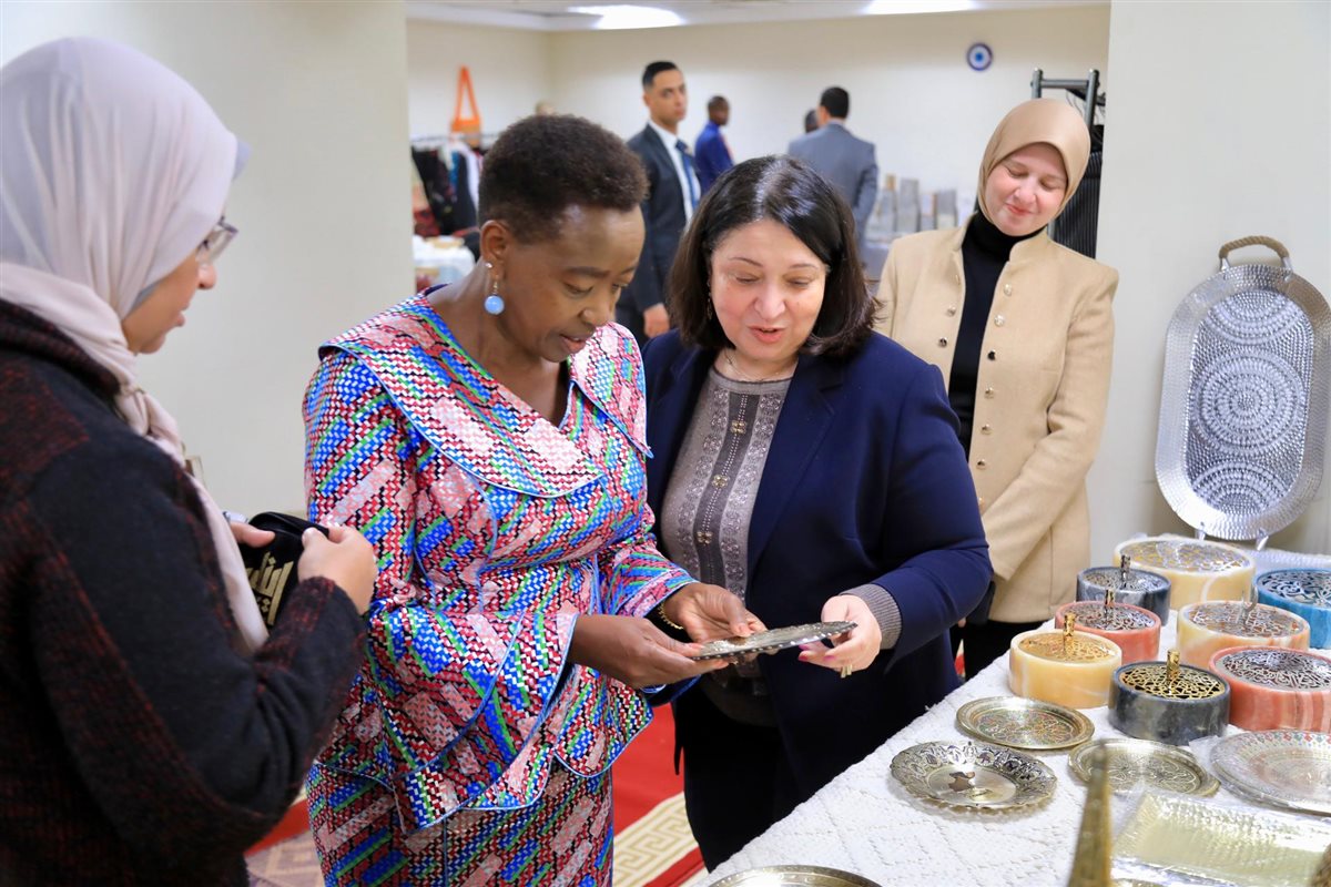 وعقب ذلك تفقدت حرم رئيس جمهورية كينيا معرض الأسر المنتجة بمقر الوزارة، وأطلعت على المنتجات اليدوية التراثية المتنوعة داخله، والتي تنوعت ما بين نحاس وخيامية وخزف والعبايات وأشغال التطريز اليدوي ومنتجات الصدف والخوص وأخميم والسجاد والكليم والمعروضات السيناوية ذات الطابع الأصيل، حيث استمعت لشرح من العارضين عن تلك المنتجات، مشيدة بالمنتجات اليدوية التراثية المصرية وجودتها.