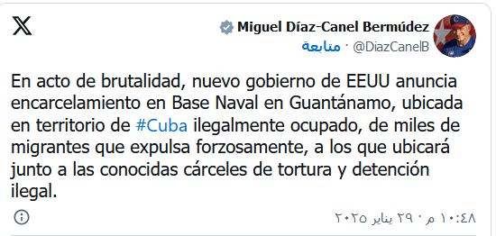 وقال الرئيس الكوبي في تدوينة على منصة "إكس" يوم الأربعاء: "في عمل وحشي، أعلنت الحكومة الأمريكية الجديدة أنها ستسجن آلاف المهاجرين في قاعدة جوانتانامو البحرية الواقعة في الأراضي الكوبية المحتلة بشكل غير قانوني وتطردهم قسرًا".