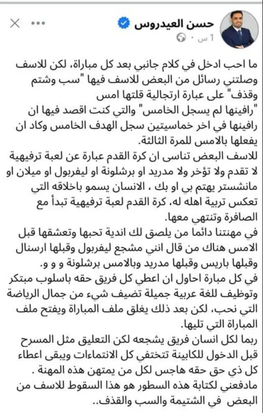 وكتب العيدروس بيانًا عبر صفحته الشخصية بموقع فيسبوك قائلًا إنه لا يحب الدخول في أمور فرعية بعد كل مباراة، لكنها تلقى رسائل تحمل سباب بسبب تعليقه على هدف برشلونة.