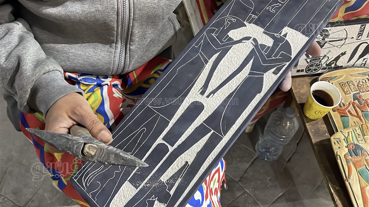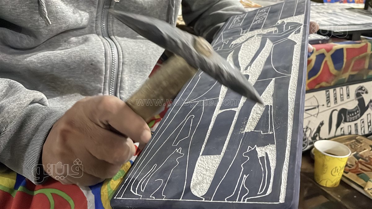 داخل الورش الصغيرة المنتشرة في السوق، يجلس الحرفيون وقد غطى الغبار وجوههم وأيديهم وهم ينحتون بمهارة لوحات حجرية تحاكي النقوش الفرعونية.