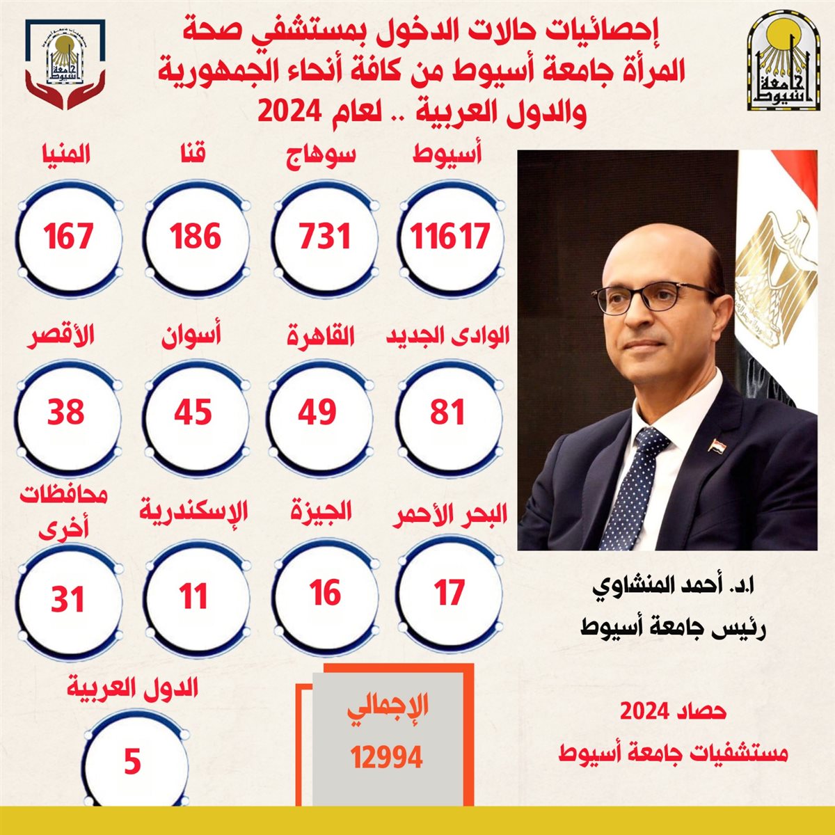وفي سياق متصل، رصد التقرير؛ استقبال مستشفى صحة المرأة الجامعى بأسيوط (12994) حالة دخول؛ حيث استقبل المستشفى من محافظة أسيوط (11617) حالة، ومن محافظة سوهاج (731) حالة، ومحافظة قنا (186) حالة، ومحافظة المنيا (167)، ومحافظة الوادي الجديد (81) حالة، ومحافظة القاهرة (49)، ومحافظة أسوان (45)، ومحافظة الأقصر (38) حالة، ومحافظة البحر الأحمر (17) حالة، ومحافظة الجيزة (16) حالة، ومحافظة الإسكندرية (11) حالة، إلى جانب (31) حالة، من محافظات أخرى، وكذلك (5) حالات من الدول العربية الشقيقة؛ السودان، ليبيا، فلسطين، والجزائر.