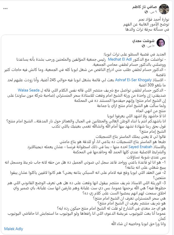 وتابعت: "الدكتور حسام لطفي تواصل مع شريف منتصر اللي قال له نفس الكلام اللي قاله لولاء صادق صديقتي: إن واحدة من ورثة الشيخ إمام وقعت للأستاذة سحر المنسترلي (صاحبة شركة مون ساوند) على إن الشيخ امام منتج! وإنهم حيقدموا المستند ده في المحكمة، ولما سألت هو الشيخ إمام منتج إزاي يا جماعة منتج من أنهي اتجاه".