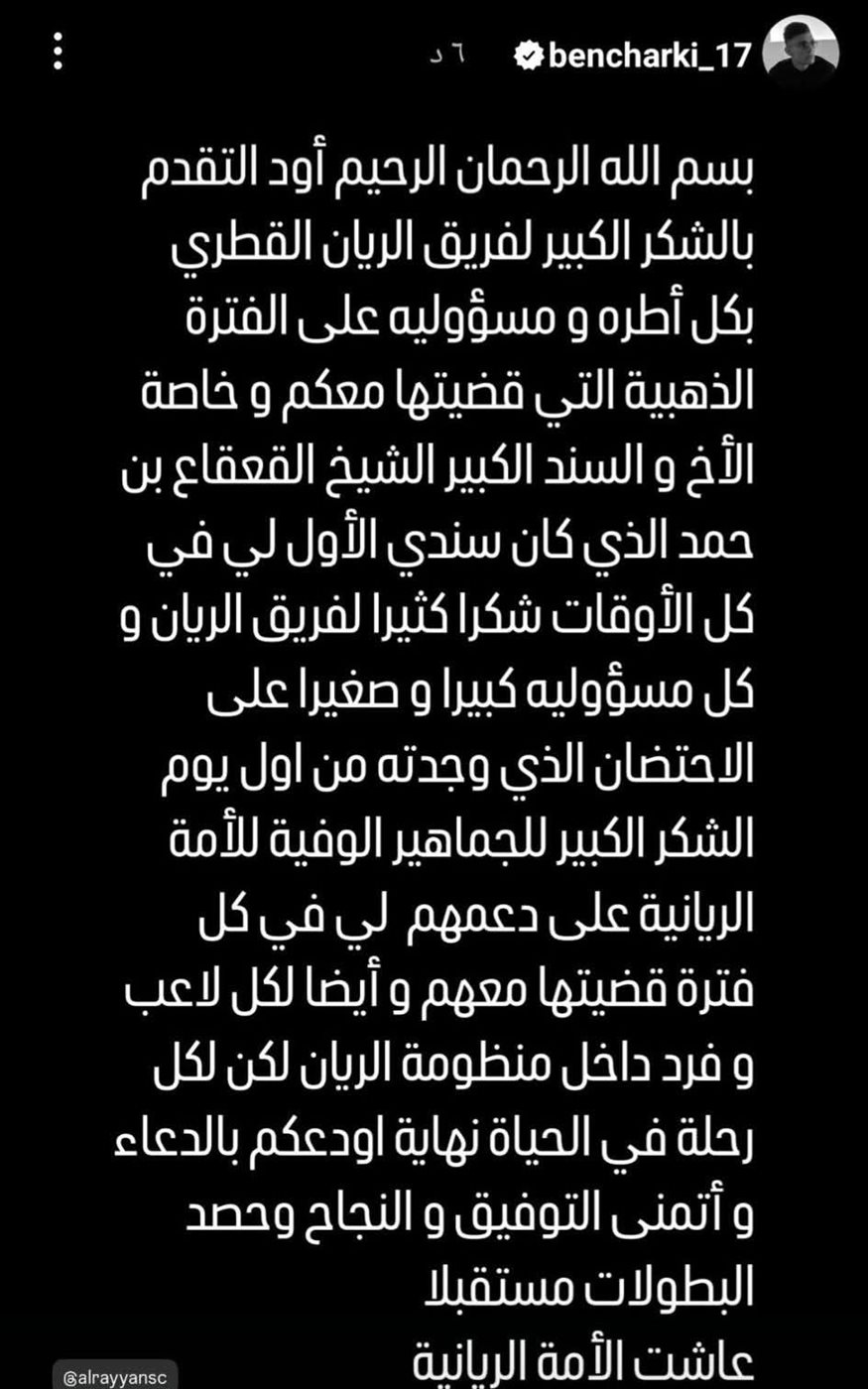 أصدر أشرف بن شرقي لاعب الأهلي الجديد، بيانا رسميا عبر صحفته ودع خلاله نادي الريان القطري بعد انتقاله إلى الأهلي لمدة موسمين ونصف.