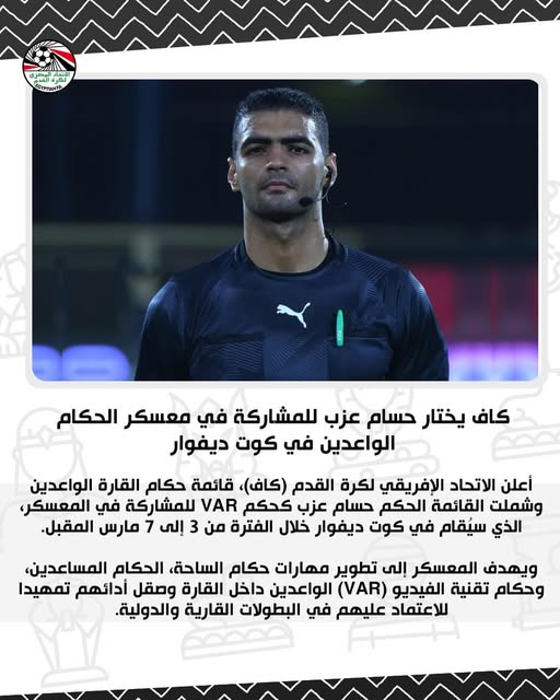 أعلن الاتحاد الإفريقي لكرة القدم (كاف)، قائمة حكام القارة الواعدين، وشملت القائمة الحكم حسام عزب كحكم VAR للمشاركة في المعسكر، الذي يُقام في كوت ديفوار خلال الفترة من 3 إلى 7 مارس المقبل.