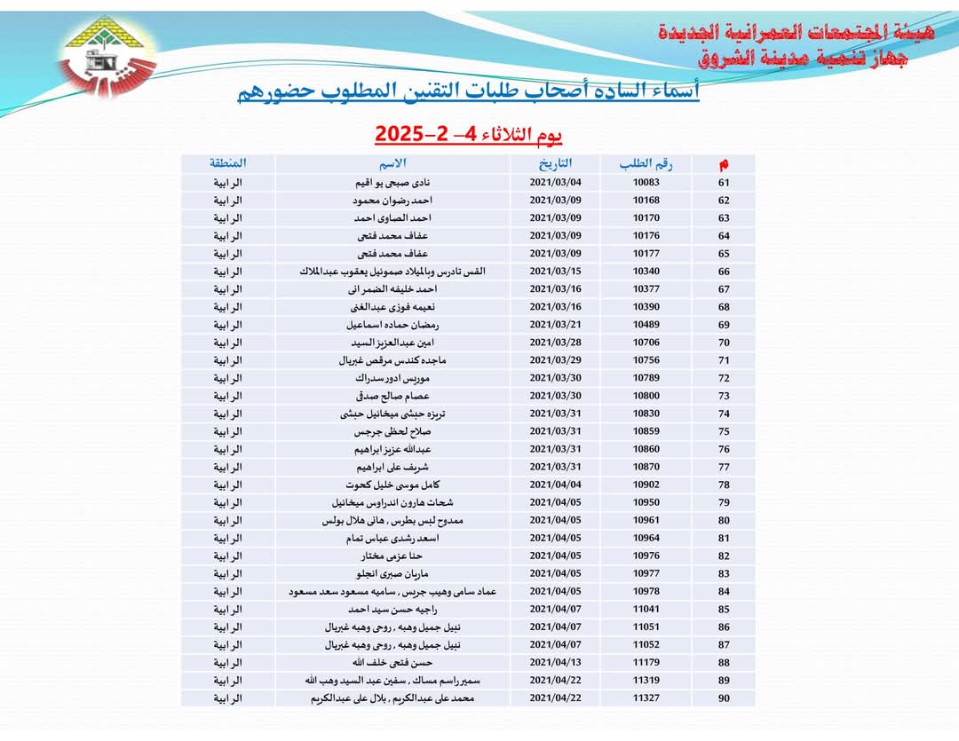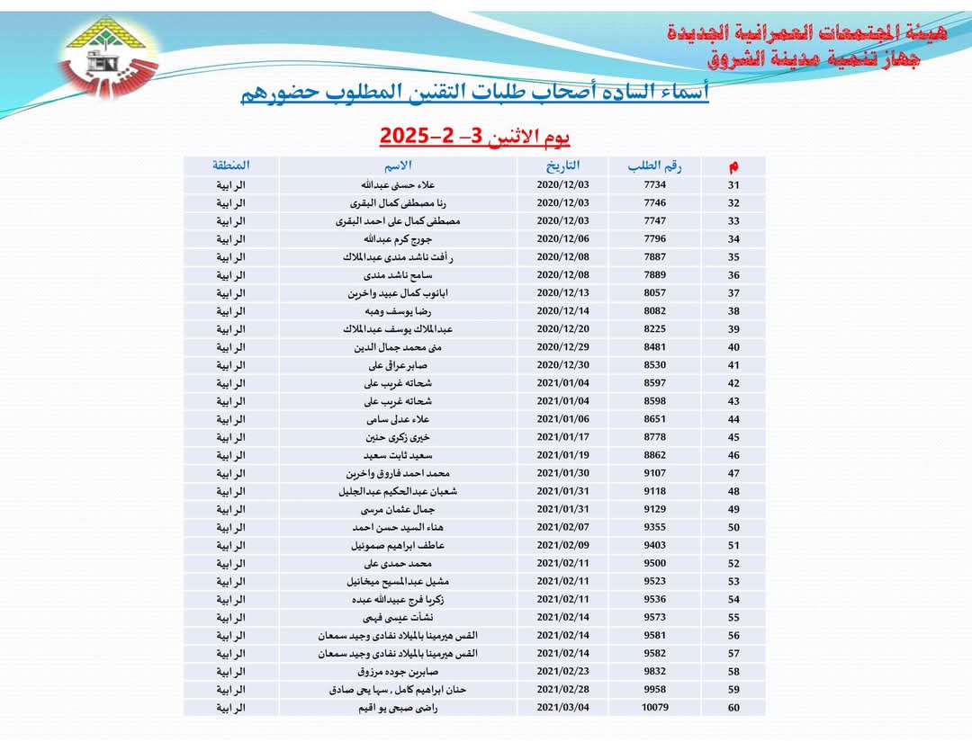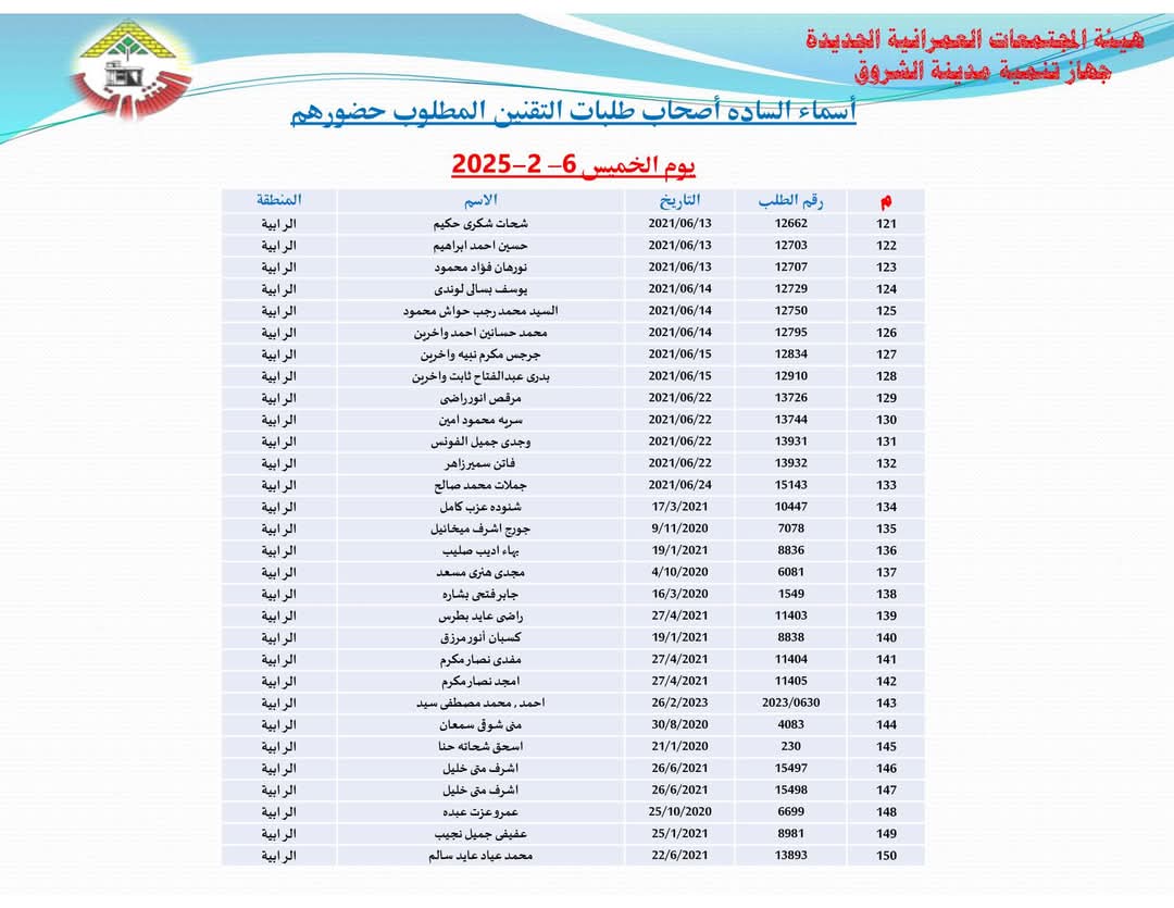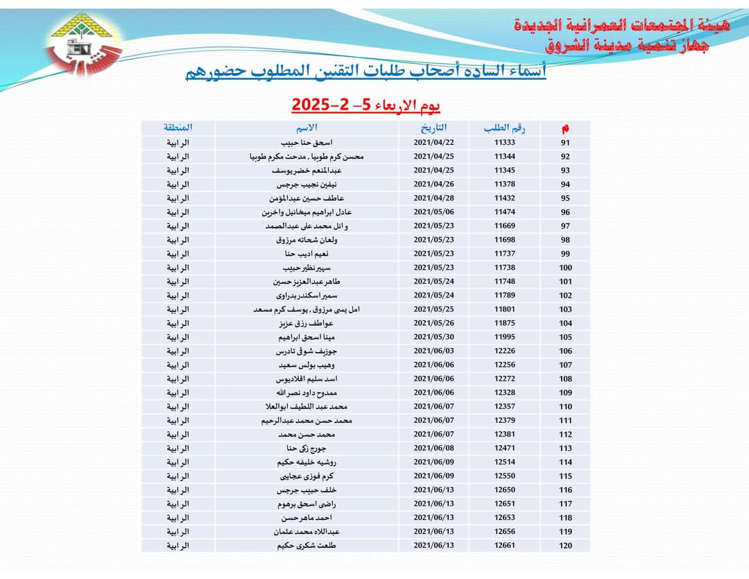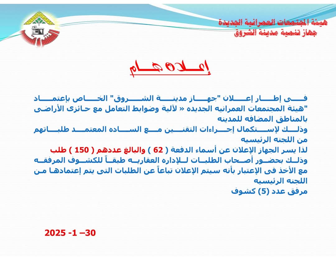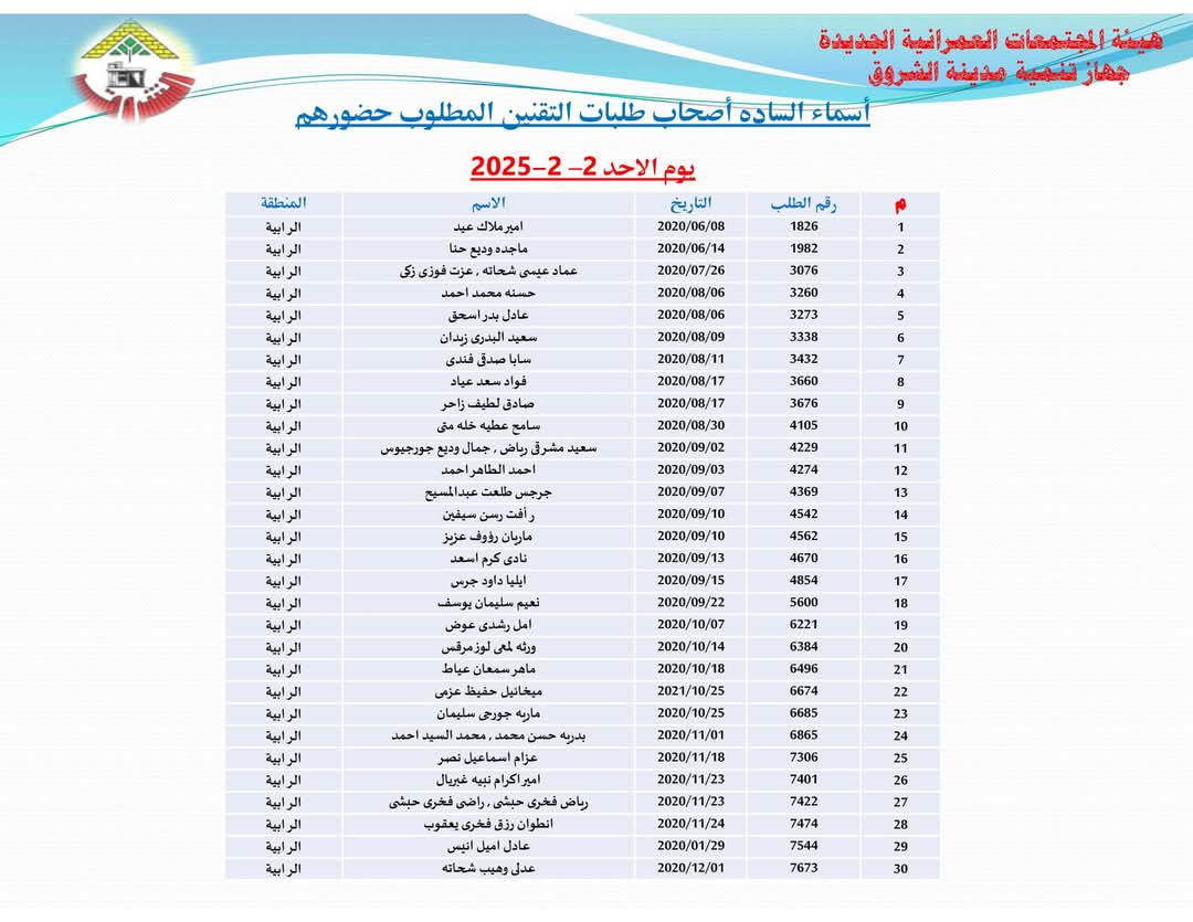 أعلنت هيئة المجتمعات العمرانية بوزارة الإسكان عن أسماء دفعة جديدة من المواطنين أصحاب طلبات تقنين أراضيهم بتوسعات مدينة الشروق، وذلك للحضور لمقر جهاز المدينة لاستكمال إجراءات التقنين ا الأحد المقبل الموافق 2 فبراير وحتى الخميس 6 فبراير لاستكمال إجراءات التقنين.