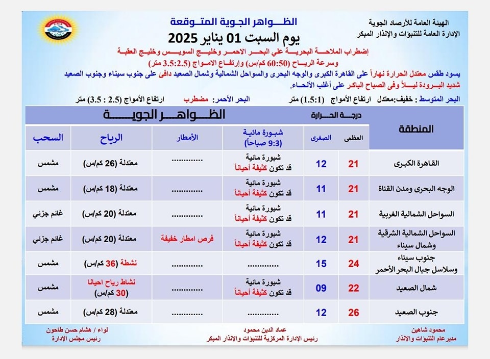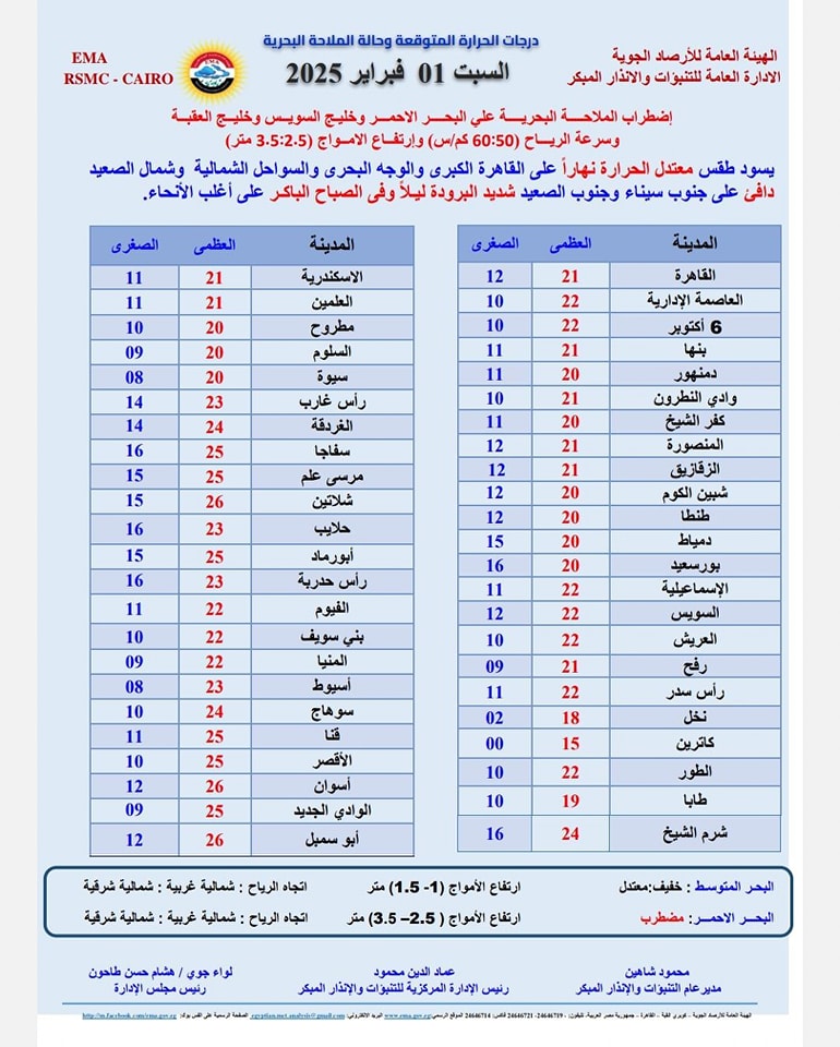 ونشرت هيئة الأرصاد الجوية بيانا بـ درجات الحرارة اليوم السبت على مدن ومحافظات مصر، وجاءت كالتالي:
