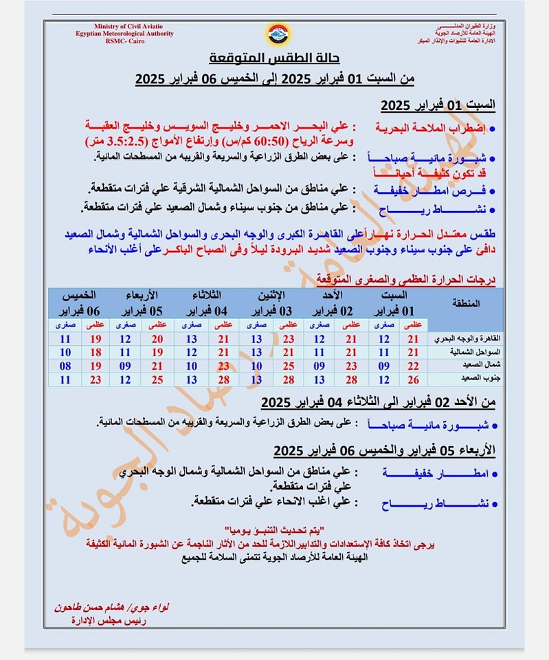 وأوضحت أيضا أن طقس غدا الأحد 2 فبراير إلى الثلاثاء 4 فبراير 2025 يشهد شبورة مائية صباحًا على بعض الطرق الزراعية والسريعة والقريبة من المسطحات المائية.
