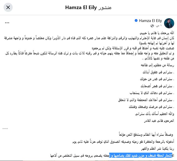 حرص الفنان حمزة العيلى على نعي موظف دار الأوبر الذى أنهى حياته منذ أيام، وكتب عبر حسابه الخاص على موقع التوالص الاجتماعي: "الله يرحمك يا هاني يا حبيبي".