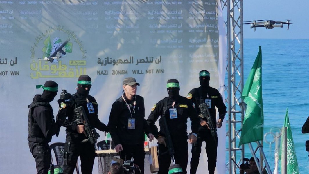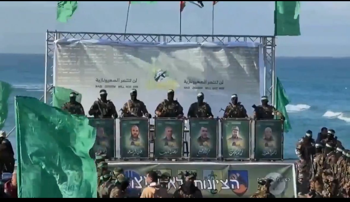 وعلقت حركة المقاومة حماس اليوم السبت، على عملية تسليم الـ3 أسرى الإسرائيليين، والذي يحمل أحدهم الجنسية الأمريكية، أمام منصة تحمل صور شهداء قادة كتائب القسام.