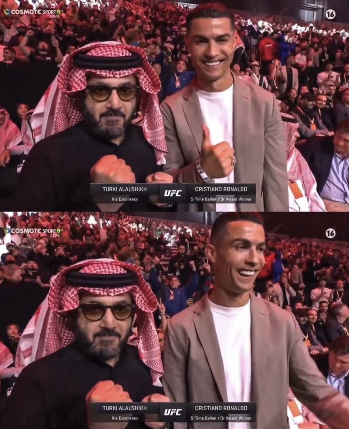 تداول رواد مواقع التواصل الاجتماعي فيديو لكريستيانو رونالدو لاعب النصر السعودي، مع المستشار تركي آل الشيخ، رئيس الهيئة العامة للترفيه بالمملكة العربية السعودية، للترويج لفعاليات "موسم الرياض" المختلفة، وبالتحديد نزالات الملاكمة "UFC"، التي تجرى على أرض المملكة.