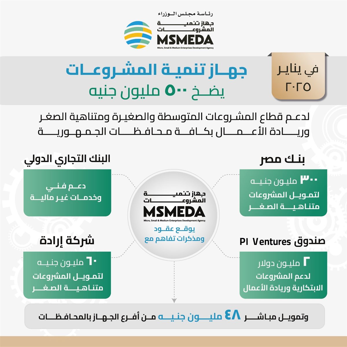 قام جهاز تنمية المشروعات المتوسطة والصغيرة ومتناهية الصغر بضخ تمويلات تزيد عن 500 مليون جنيه لتمويل المشروعات المتوسطة والصغيرة ومتناهية الصغر بالتعاون مع كبرى البنوك والمؤسسات المالية بالإضافة الي أنشطته التمويلية من خلال فروعه علي مستوي الجمهورية.