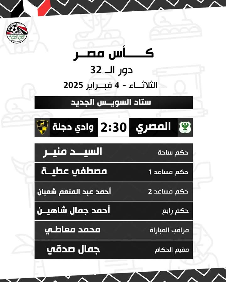 كأس مصر، أعلنت لجنة الحكام باتحاد الكرة المصري، أسماء حكام مباراتي غد الثلاثاء، ضمن مواجهات دور الـ32 من مسابقة كأس مصر.