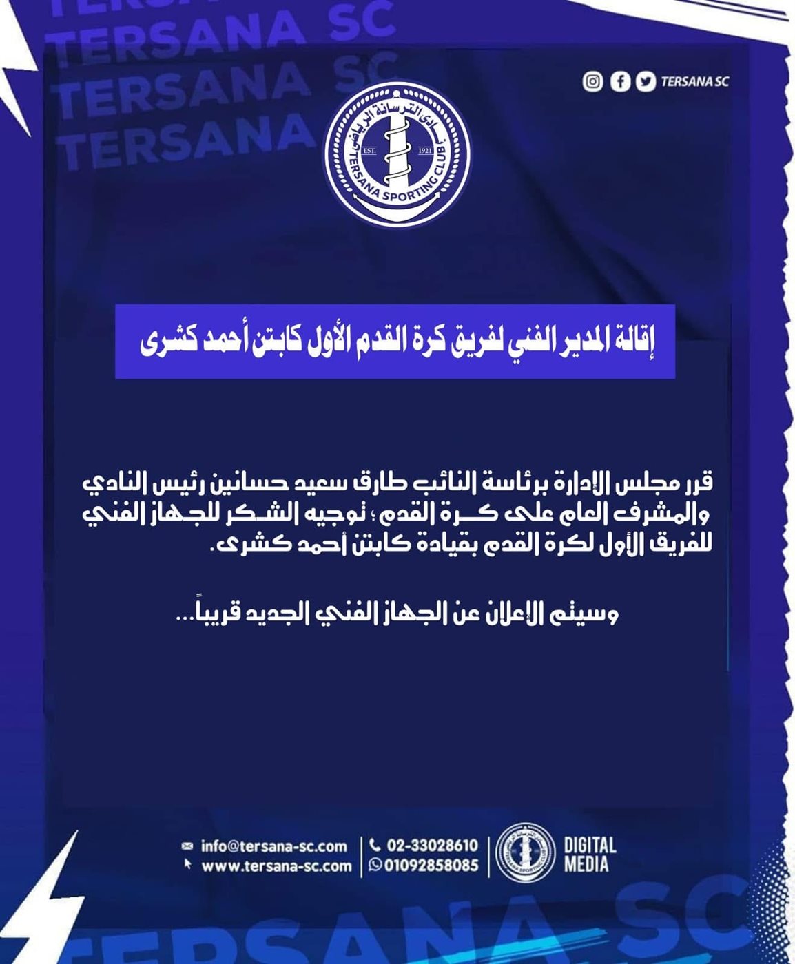 الترسانة يعلن تعيين أحمد عبد المقصود مديرا فنيا للفريق خلفا لـ كشري