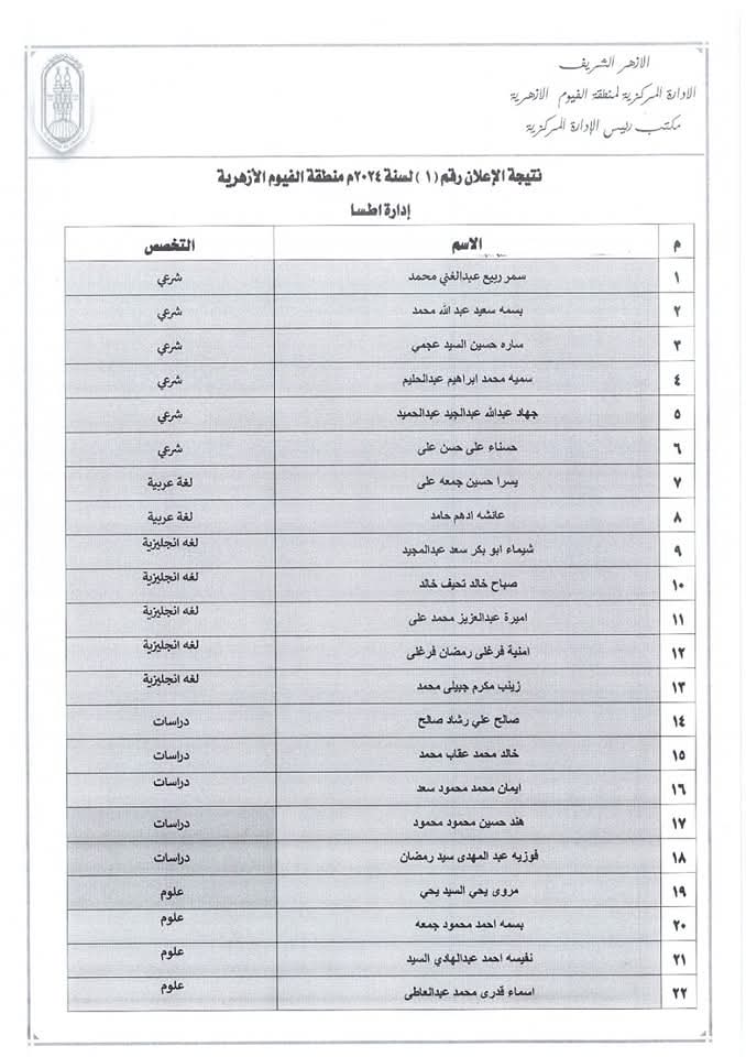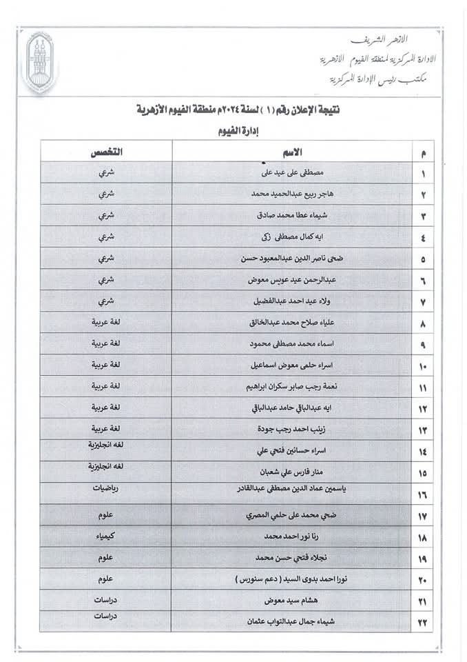منطقة الفيوم الأزهرية تعلن أسماء المقبولين للعمل بالحصة في المعاهد الدينية