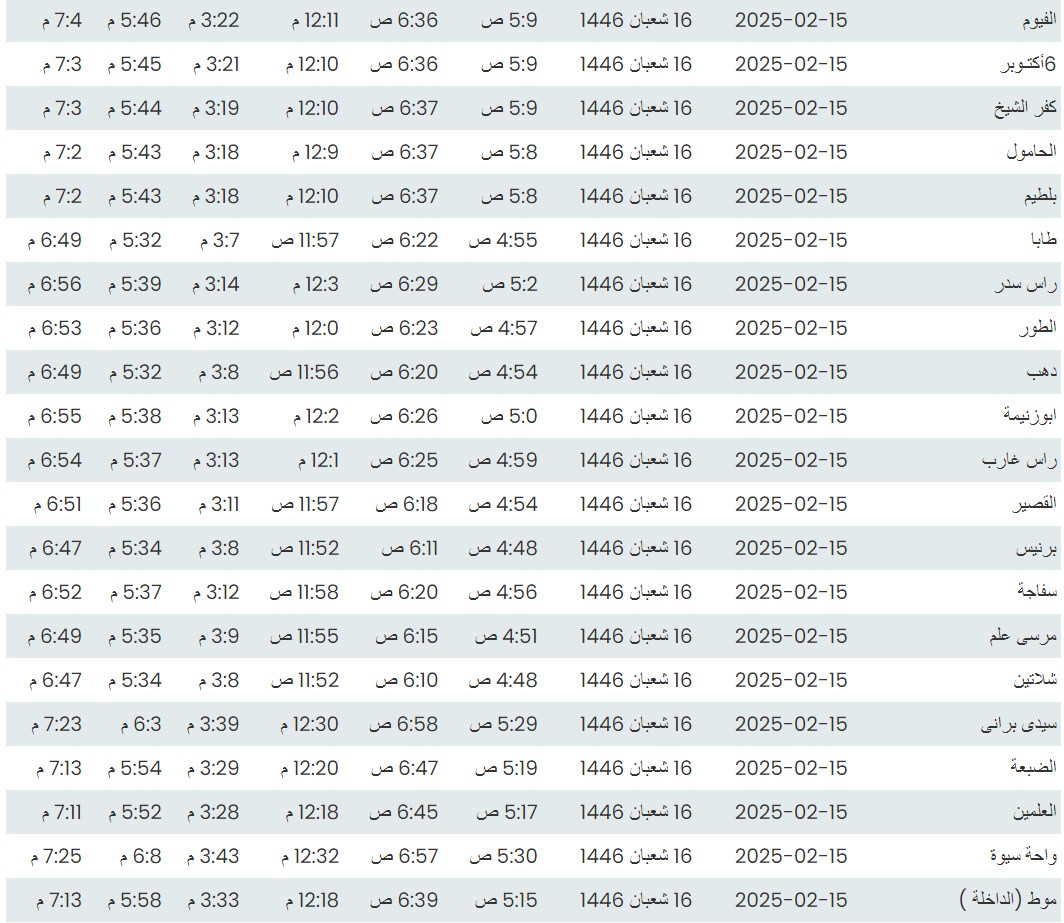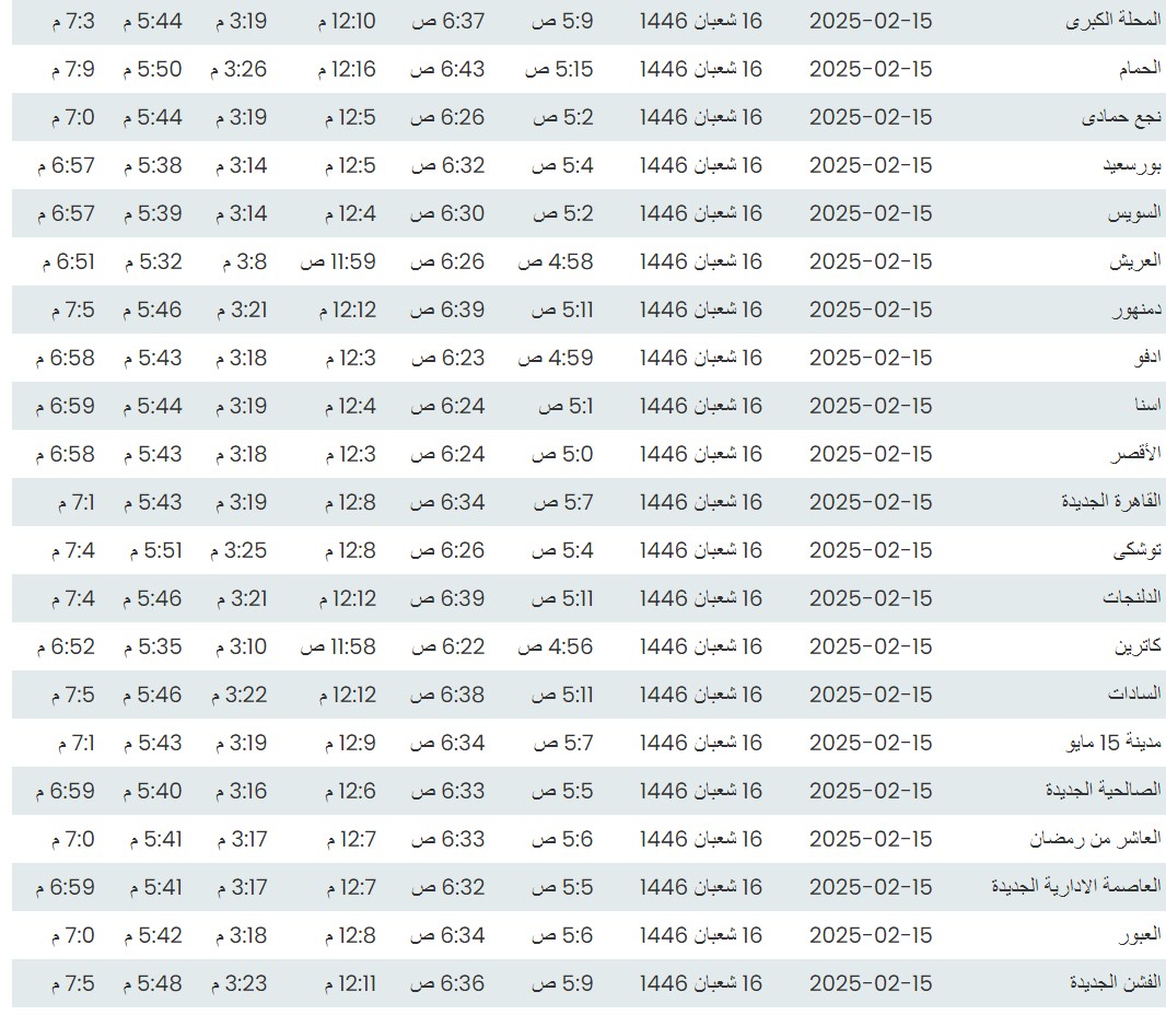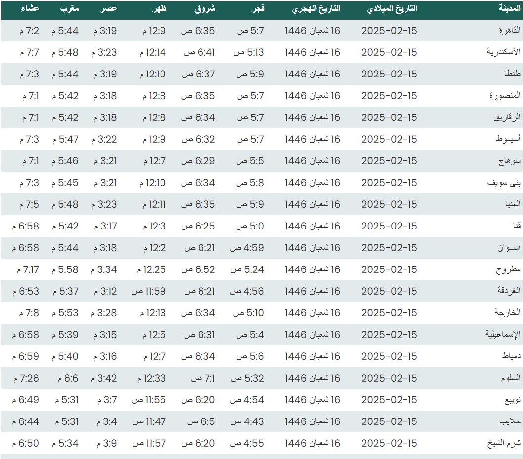 مواقيت الصلاة اليوم السبت 15 - 2- 2025 في القاهرة والمحافظات