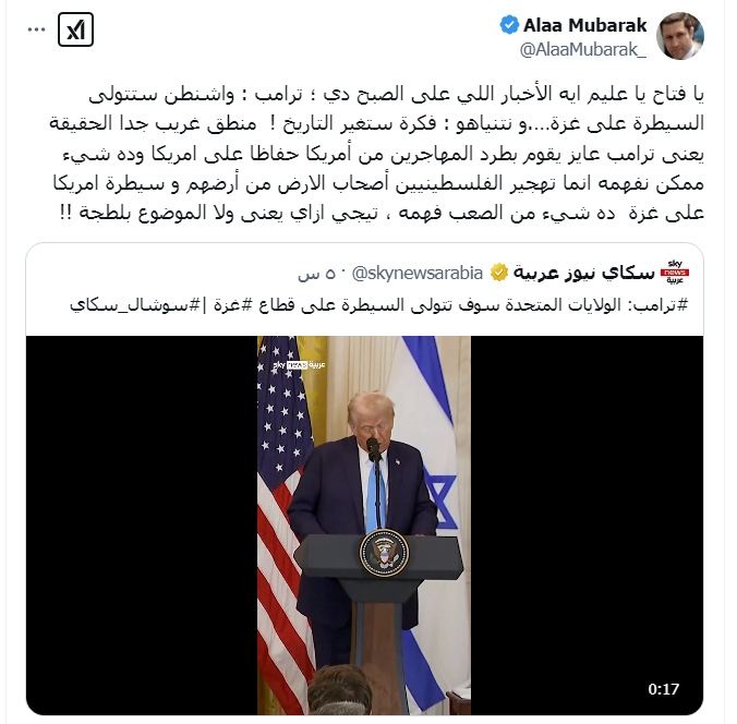 وعبر علاء مبارك عن اندهاشه من قرار ترامب، فقال: "منطق غريب جدًا الحقيقة يعنى ترامب عايز يقوم بطرد المهاجرين من أمريكا حفاظا على أمريكا وده شيء ممكن نفهمه، إنما تهجير الفلسطينيين أصحاب الأرض من أرضهم وسيطرة أمريكا على غزة، ده شيء من الصعب فهمه، تيجي إزاي يعنى ولا الموضوع بلطجة!!"