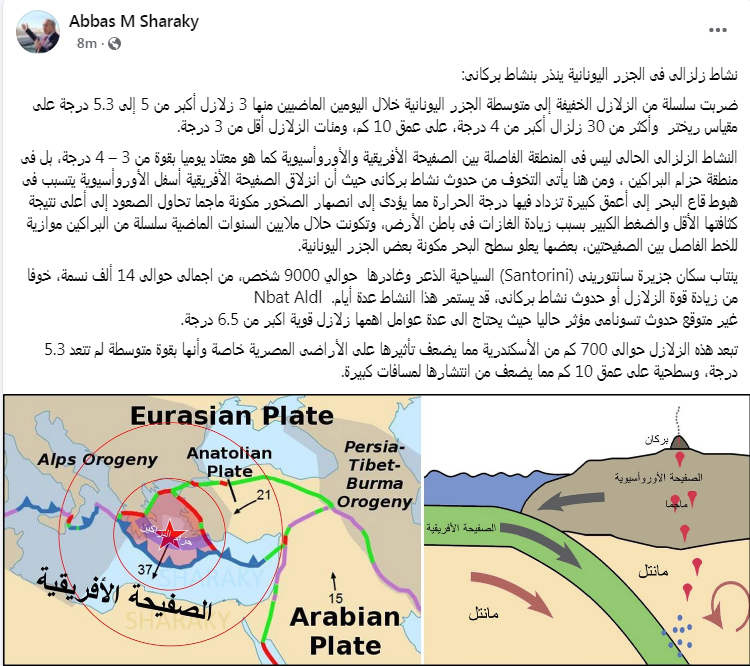 وعن التخوفات من النشاط الزلزالي الحالي في الجزر اليونانية، قال الدكتور عباس شراقي: "النشاط الزلزالى الحالى ليس فى المنطقة الفاصلة بين الصفيحة الأفريقية والأوروأسيوية كما هو معتاد يوميا بقوة من 3 – 4 درجة، بل فى منطقة حزام البراكين، ومن هنا يأتى التخوف من حدوث نشاط بركانى حيث أن انزلاق الصفيحة الأفريقية أسفل الأوروأسيوية يتسبب فى هبوط قاع البحر إلى أعمق كبيرة تزداد فيها درجة الحرارة مما يؤدى إلى انصهار الصخور مكونة ماجما تحاول الصعود إلى أعلى نتيجة كثافتها الأقل والضغط الكبير بسبب زيادة الغازات فى باطن الأرض".