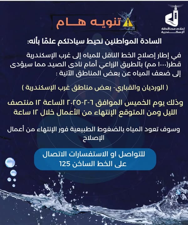 وناشدت مياه الإسكندرية، المواطنين توفير احتياجاتهم من المياه خلال تلك الفترة، وعند الحاجة يرجى الاتصال على رقم 125.