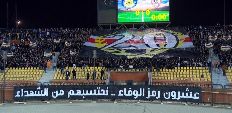ورفعت جماهير الزمالك لافتة خلال المباراة تحمل عباراة “عشرون رمز الوفاء.. نحتسبهم من الشهداء”.
