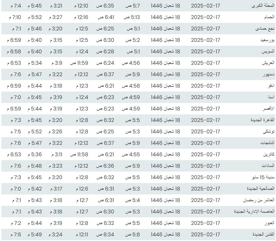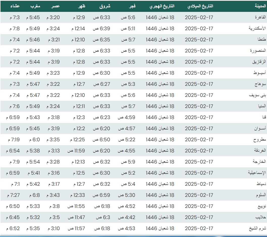 وفيما يلي مواقيت الصلاة، لعدد من مدن ومحافظات الجمهورية من واقع بيانات الهيئة العامة للمساحة