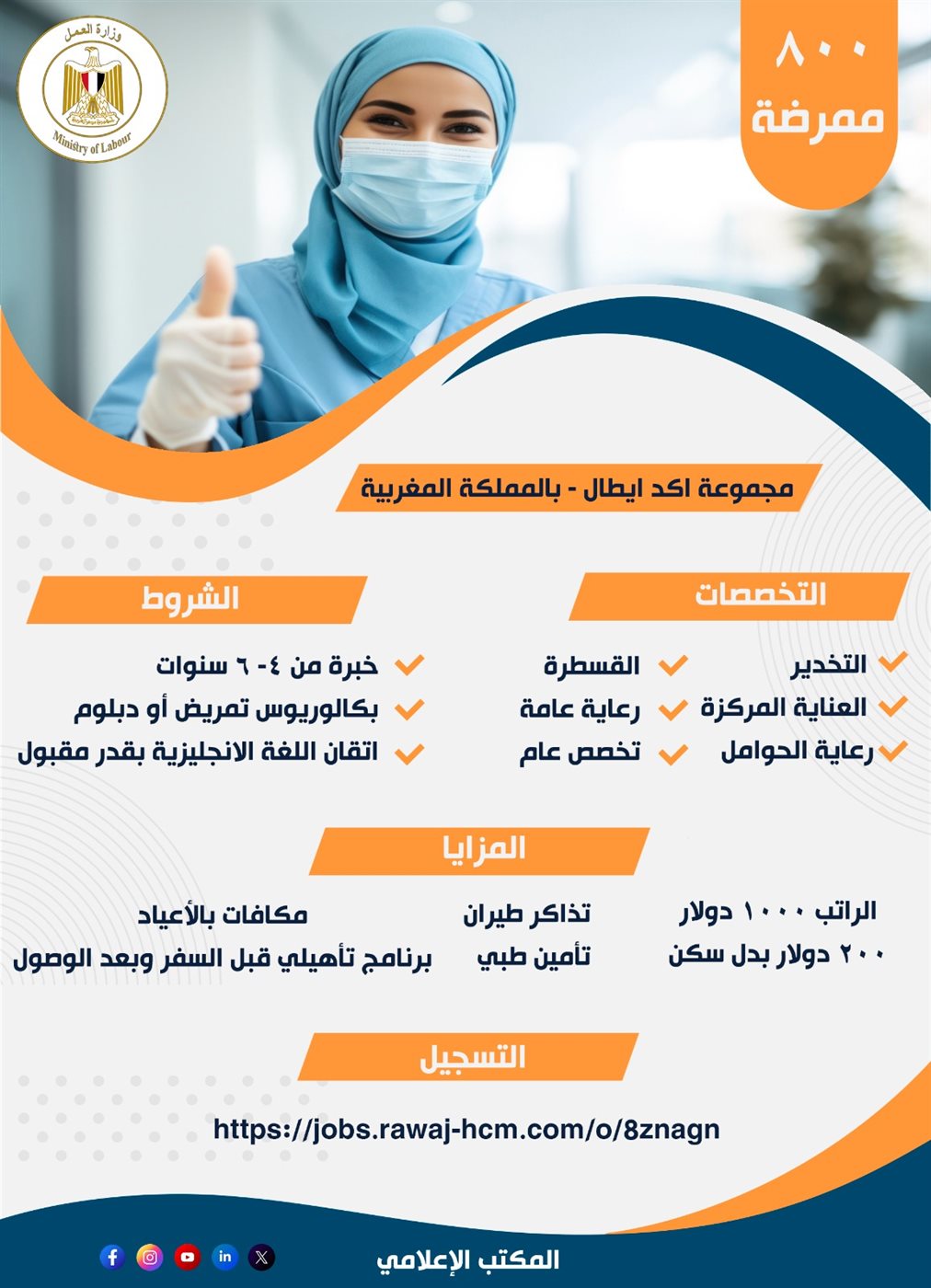 وأوضحت هبة أحمد مدير الإدارة العامة للتشغيل بالوزارة أن تلك الفرص تأتي تلبيةًَ لاحتياجات شركة رواج لتطوير الموارد الإدارية والتي ترغب في توفير فرص عمل من الكوادر الطبية المصرية للعمل بمجموعة "اكد ايطال" بالمملكة المغربية، حيث سيتم منح راتب بقيمة ۱۰۰۰ دولار و٢٠٠ دولار بدل سكن بالإضافة إلى تذاكر الطيران والتأمين الطبي ومكافآت بالأعياد، إلى جانب تنفيذ برنامج تأهيلي قبل السفر وبعد الوصول، على أن يتم التقديم من اليوم السبت الموافق 8-2-2025 ولمدة 10 أيام، على الرابط هنا