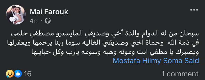 وكتبت مي فاروق: "سبحان من له الدوام والدة أخي وصديقي المايسترو مصطفي حلمي في ذمة الله.. وحماة أختي وصديقتي الغالية سوما ربنا يرحمها ويغفر لها.. ويصبرك يا مصطفى انت ومونه وهبه وسومه يارب وكل حبايبها".