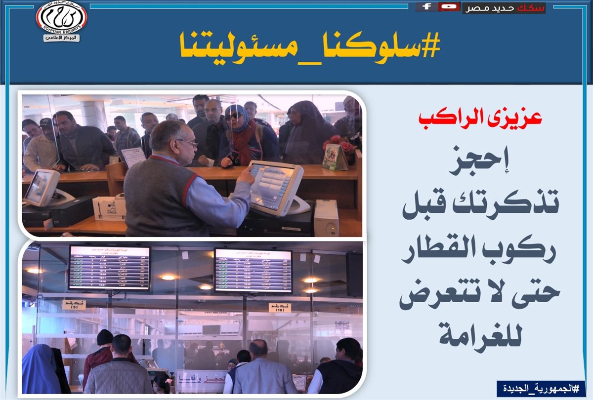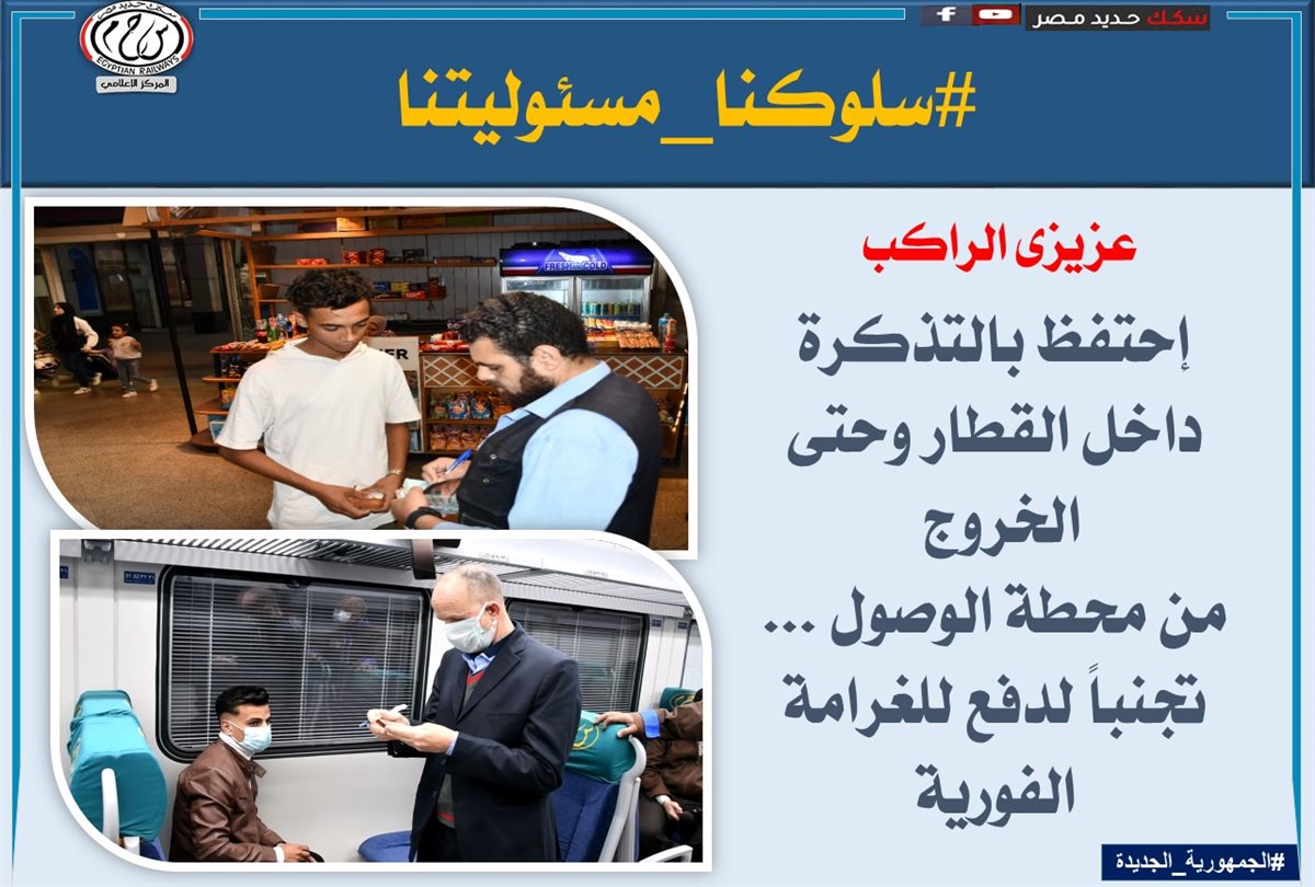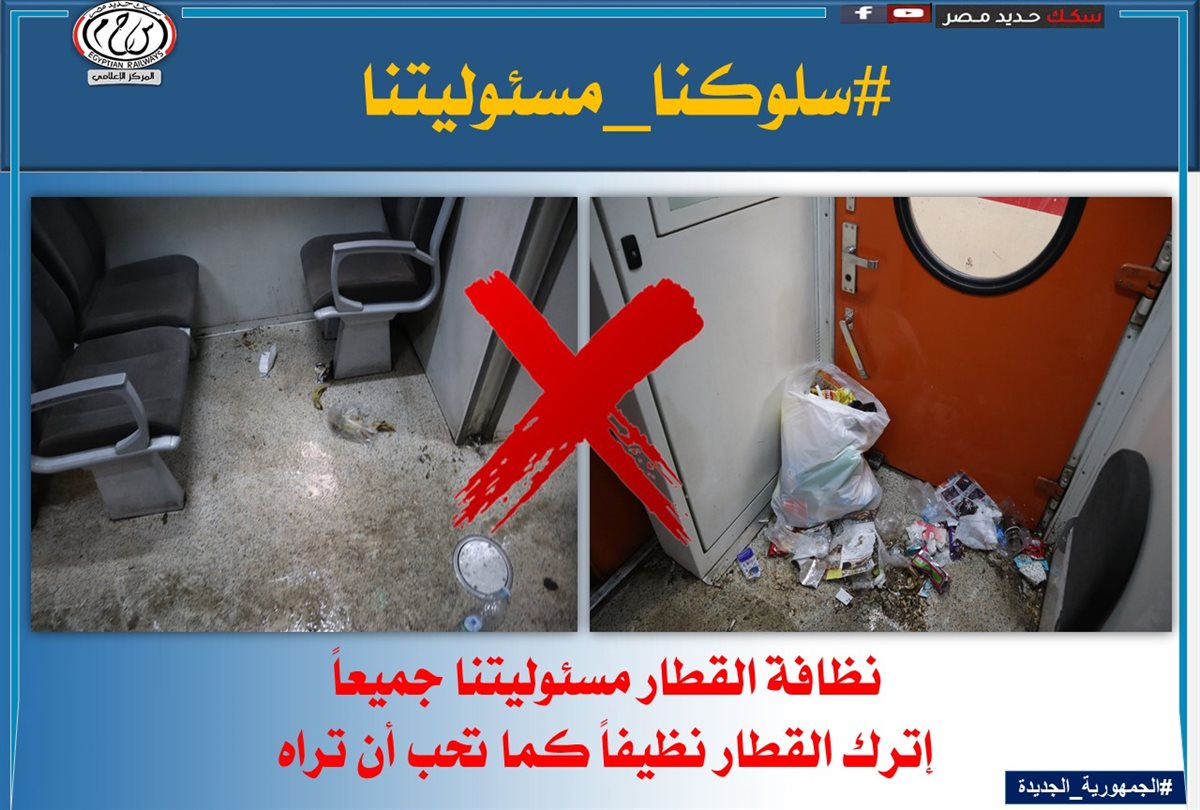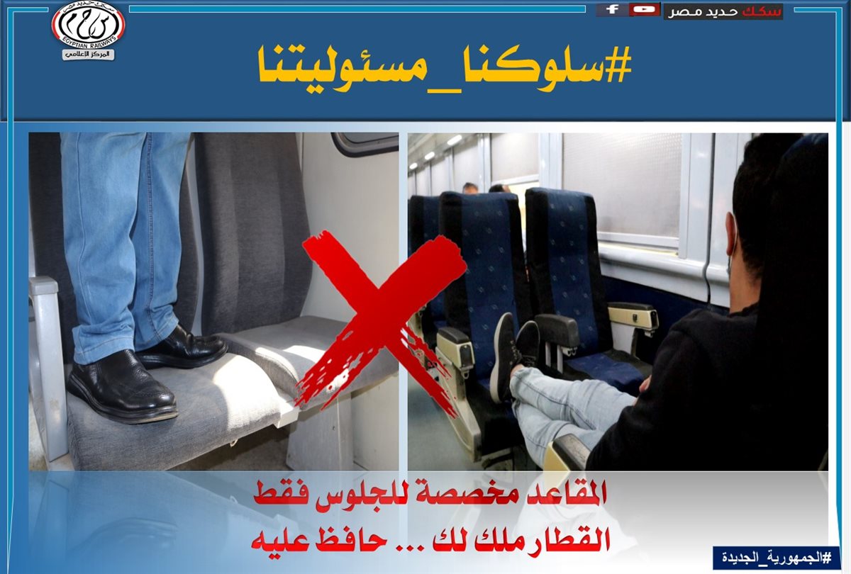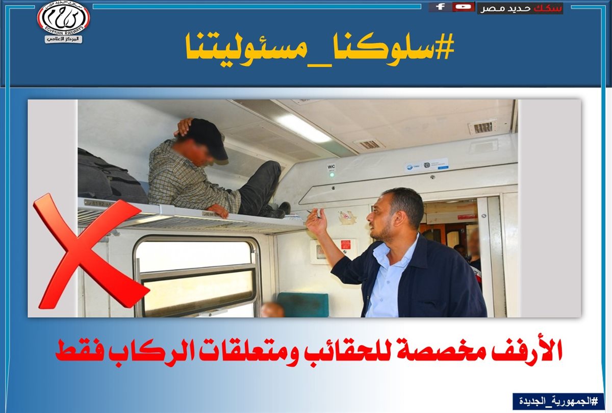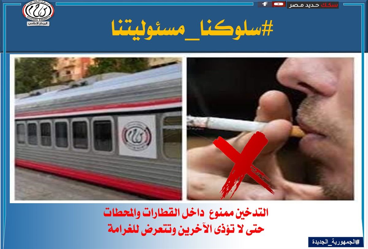 لذا تناشد الهيئة القومية لسكك حديد مصر جمهور الركاب بالالتزام بالسلوكيات الصحيحة داخل القطارات أو بالمحطات لعدم المسائلة القانونية والمشاركة معها فى التوعية ضد هذه السلوكيات الخاطئة.