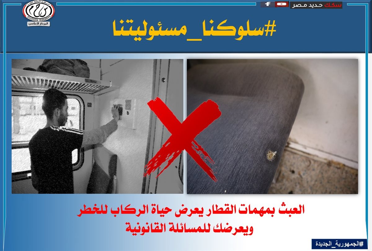 أطلقت السكك الحديد حملة للتحذير من بعض السلوكيات الخاطئة والتى يقوم بها بعض الركاب، وذلك في ظل ما تقوم به الحكومة المصرية ممثلة فى وزارة النقل من تطوير وتحديث شامل لمرفق السكك الحديدية باعتباره أحد أهم المرافق الحيوية التي تخدم المواطنين.