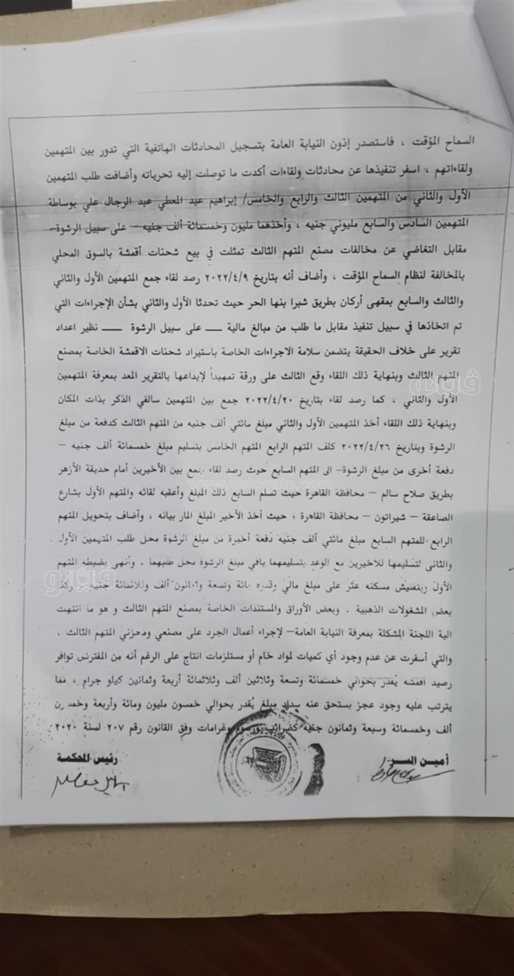 وأكدت التحريات أنه بتاريخ ٢٠٢٢/٤/٩ رصد لقاء جمع المتهمين الأول والثاني والثالث والسابع بمقهى أركان بطريق شبرا بنها الحر حيث تحدثا الأول والثاني بشأن الإجراءات التي تم اتخاذها في سبيل تنفيذ مقابل ما طلب من مبالغ مالية على سبيل الرشوة.