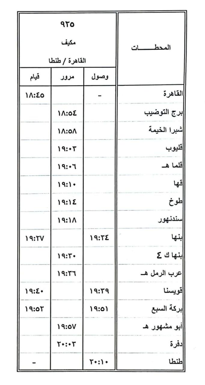 قررت هيئة السكة الحديد تعديل مواعيد قطار رقم 925 مكيف درجة أولى وثانية اعتبارا من أول مارس الموافق يوم السبت ٢٠٢٥/٣/١ ليكون قيام قطار ٩٢٥ مكيف (القاهرة / طنطا) من محطة القاهرة الساعة ١٨:٤٥ يصل محطة طنطا الساعة ۲۰:۱۰ كالجدول المرفق.