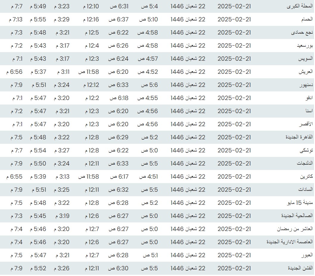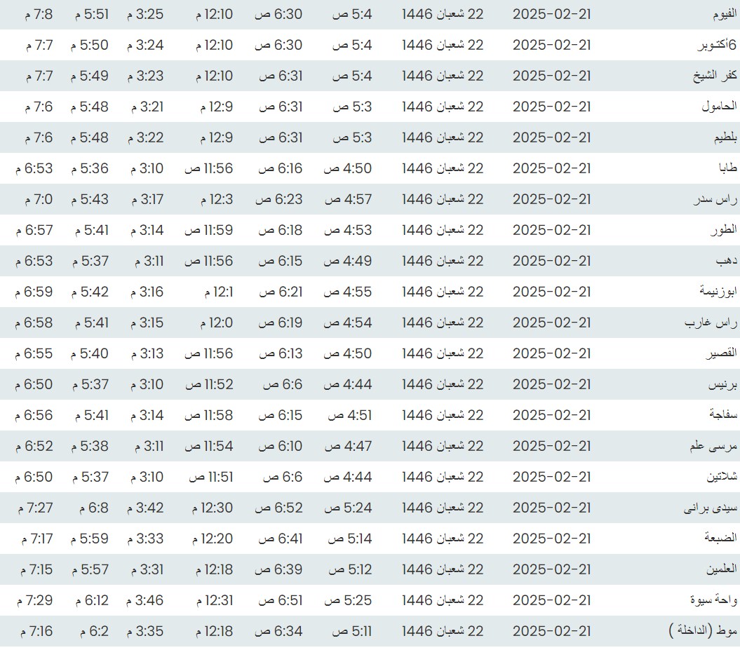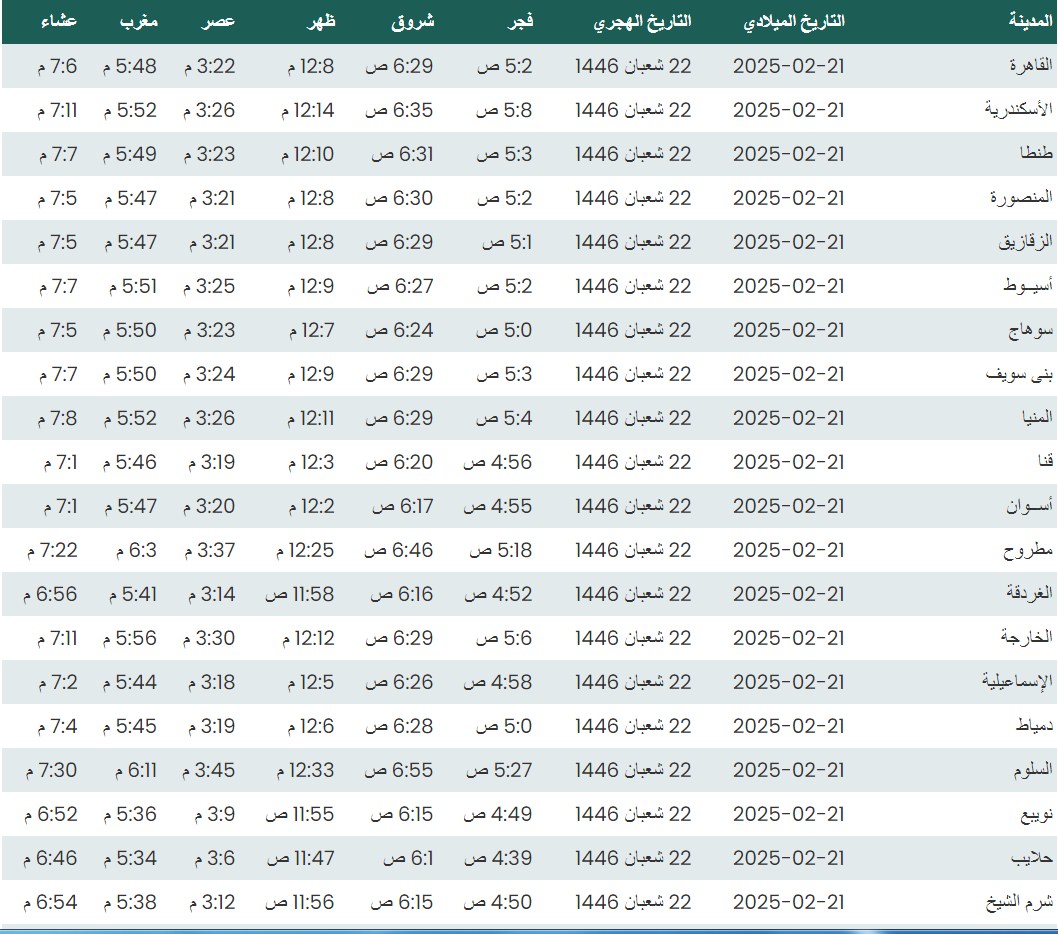 وفيما يلي مواقيت الصلاة، لعدد من مدن ومحافظات الجمهورية من واقع بيانات الهيئة العامة للمساحة